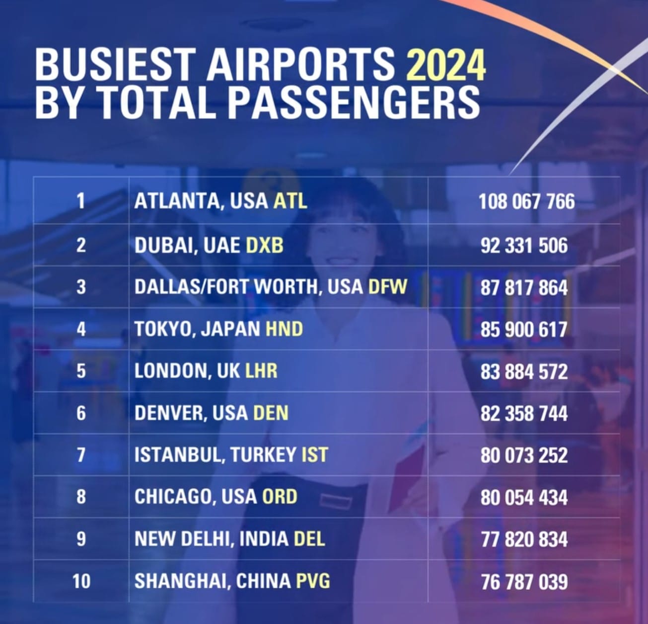 Szacuje się, że liczba wszystkich lotów na całym świecie w 2024 r. wyniosła ok. 100 mln co oznacza wzrost o 4,3 proc. w porównaniu z 2023 r. Dziesięć największych lotnisk odpowiada za ponad 6 proc. globalnego ruchu – pierwsza trójka to amerykańskie porty lotnicze: Hartsfield-Jackson w Atlancie, Chicago-O'Hare i Dallas Fort Worth.