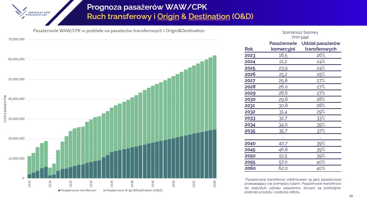 Jak tłumaczyli przedstawiciele spółki, w scenariuszu bazowym prognoza zakłada, że w 2032 r. na Lotnisku Chopina oraz w pierwszych miesiącach działania Lotniska CPK zostanie obsłużonych 31,4 mln pasażerów, a w każdym kolejnym roku ruch będzie rósł o milion osób rocznie. W roku 2033 ma to być ok. 32,7 mln osób, w 2040 roku - 40,7 mln.