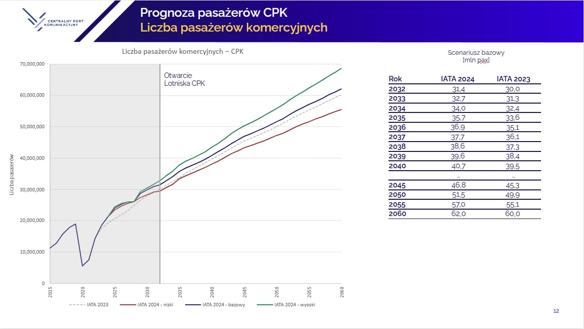 Spółka CPK w grudniu 2023 r. zaprezentowała najnowszą, zaktualizowaną prognozę IATA dla CPK. Wynikało z niej, że w 2030 r. lotnisko CPK może mieć 28 mln pasażerów, w 2040 r. 40 mln, a w 2060 r. przekroczy 60 mln osób. W 2021 r. prognoza IATA w scenariuszu bazowym wskazywała na 30 mln podróżnych w 2030 r., 45 mln w 2040 r. i 65 mln w 2060 r.