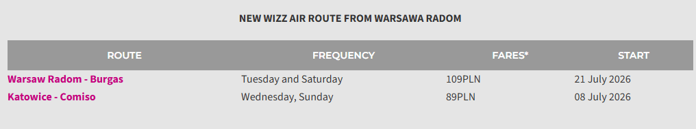 Wizz Air planuje w lipcu br. uruchomienie dwóch bezpośrednich połączeń z Polski: z lotniska Warszawa–Radom do Burgas w Bułgarii oraz z Katowice Airport do Comiso we Włoszech.