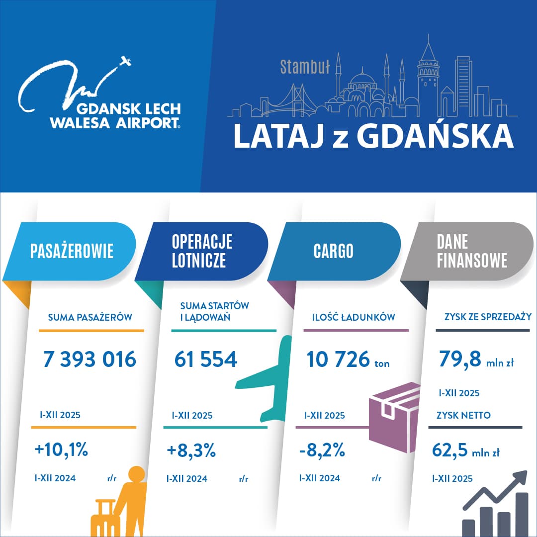 28 stycznia, podsumowując wyniki za 2025 r., władze Portu Lotniczego im. Lecha Wałęsy w Gdańsku poinformowały o obsłużeniu 7 393 016 pasażerów, co oznacza wzrost o ponad 10 proc. rok do roku.