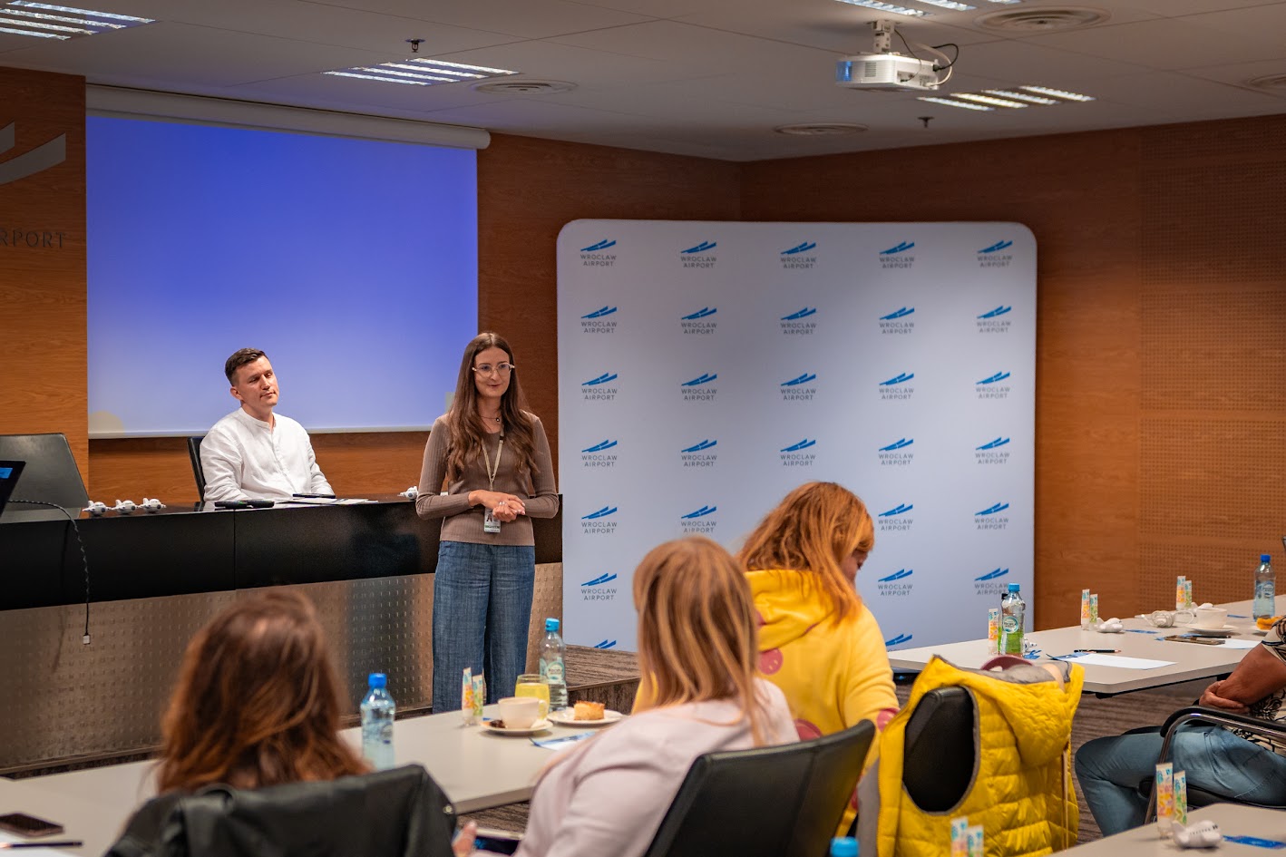 Ważnym elementem szkolenia było praktyczne zwiedzanie lotniska. Uczestnicy mieli okazję przejść przez wszystkie etapy standardowej podróży – od wejścia na terminal, przez kontrolę bezpieczeństwa, aż po boarding. Pozwoliło to nie tylko utrwalić teorię, ale też oswoić otoczenie i rytuały związane z lataniem.