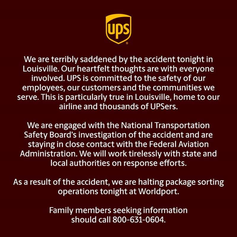 UPS wydał oświadczenie, w którym potwierdził zdarzenie i zapewnił, że współpracuje z władzami federalnymi i lokalnymi w celu wyjaśnienia przyczyn tragedii. – „Jesteśmy głęboko poruszeni tym dramatycznym wydarzeniem. Nasze myśli są z rodzinami ofiar i wszystkimi poszkodowanymi” – przekazał rzecznik firmy.