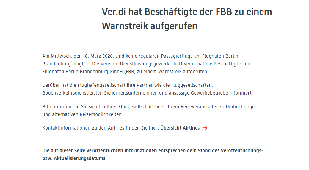 Pracownicy lotniska Berlin-Brandenburg zrzeszeni w związku zawodowym Verdi prowadzą 18 mara całodniowy strajk ostrzegawczy. Lotnisko zawiesiło połączenia.