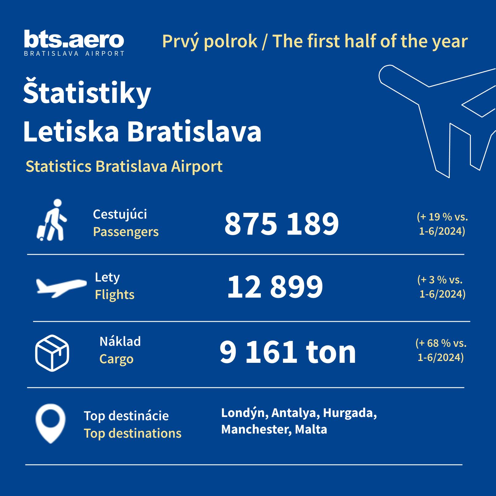 Czerwiec 2025 roku przechodzi do historii Lotniska im. M. R. Štefánika w Bratysławie. Port obsłużył 281 477 pasażerów – najwięcej w jednym miesiącu czerwcu od momentu powstania lotniska w 1951 roku.