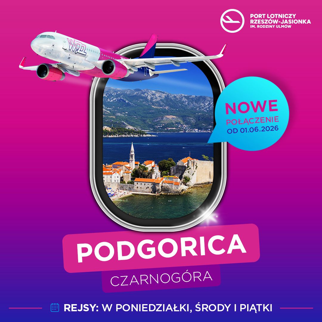 Port Lotniczy Rzeszów-Jasionka im. Rodziny Ulmów ogłasza kolejne wzmocnienie swojej siatki połączeń. Od 1 czerwca 2026 roku Wizz Air uruchomi nowe, regularne loty z Rzeszowa do stolicy Czarnogóry – Podgoricy.