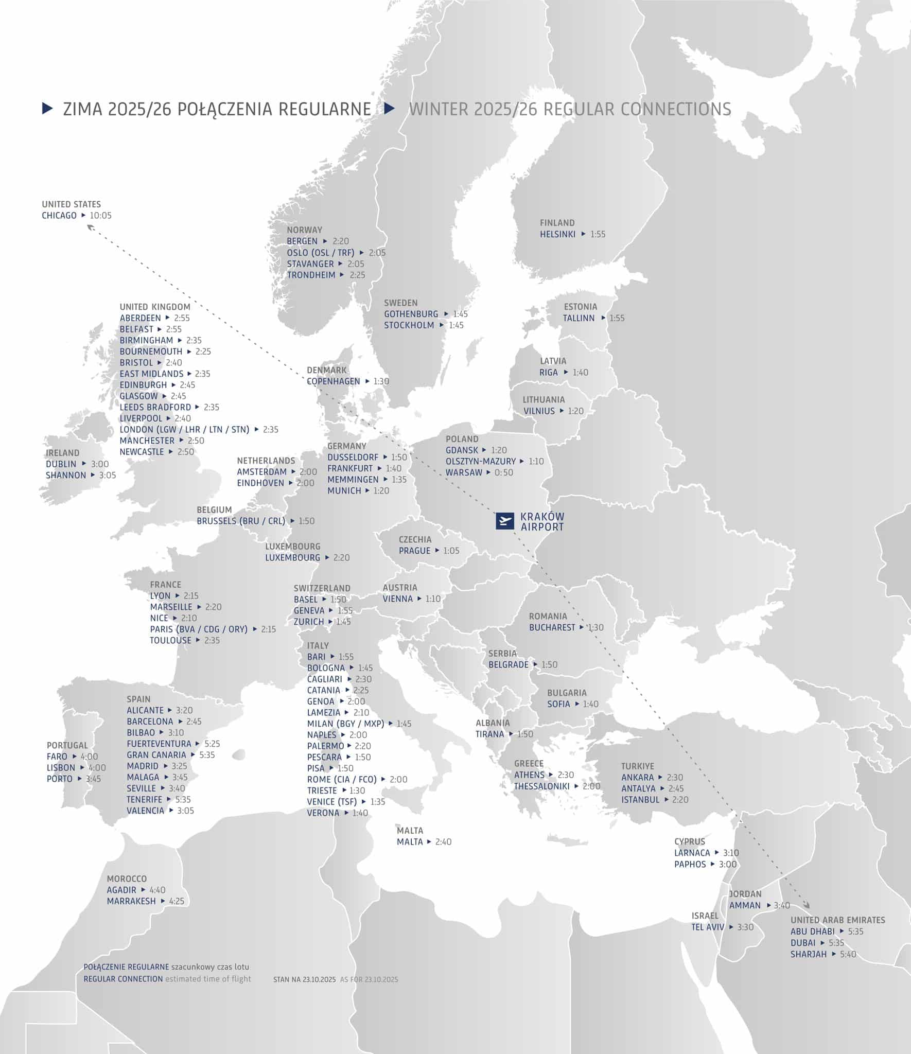 - Ile połączeń i do ilu krajów oferuje Kraków Airport w zimowym rozkładzie lotów 2025/2026?