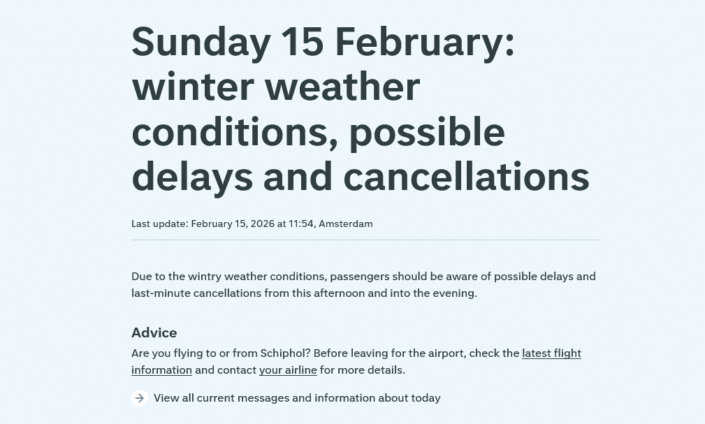 Podobna sytuacja ma miejsce w Holandii. Z powodu prognozowanych opadów śniegu i silnego wiatru odwołano w niedzielę 170 lotów z i na lotnisko Schiphol w Amsterdamie, w tym 150 rejsów linii KLM. Odwołania dotyczą połączeń zaplanowanych w godzinach od 17 do 24.