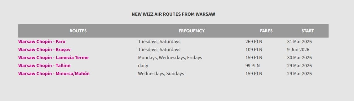 „Wizz Air uruchamia również pięć nowych połączeń z Warszawy, łącząc polską stolicę z Faro (Portugalia), Braszowem/Bra?ov (Rumunia), Lamezia Terme (Włochy), Tallinnem (Estonia) oraz całkowicie nowym kierunkiem w siatce połączeń z Warszawy – Minorką (Hiszpania)” - przekazał węgierski przewoźnik w komunikacie.
