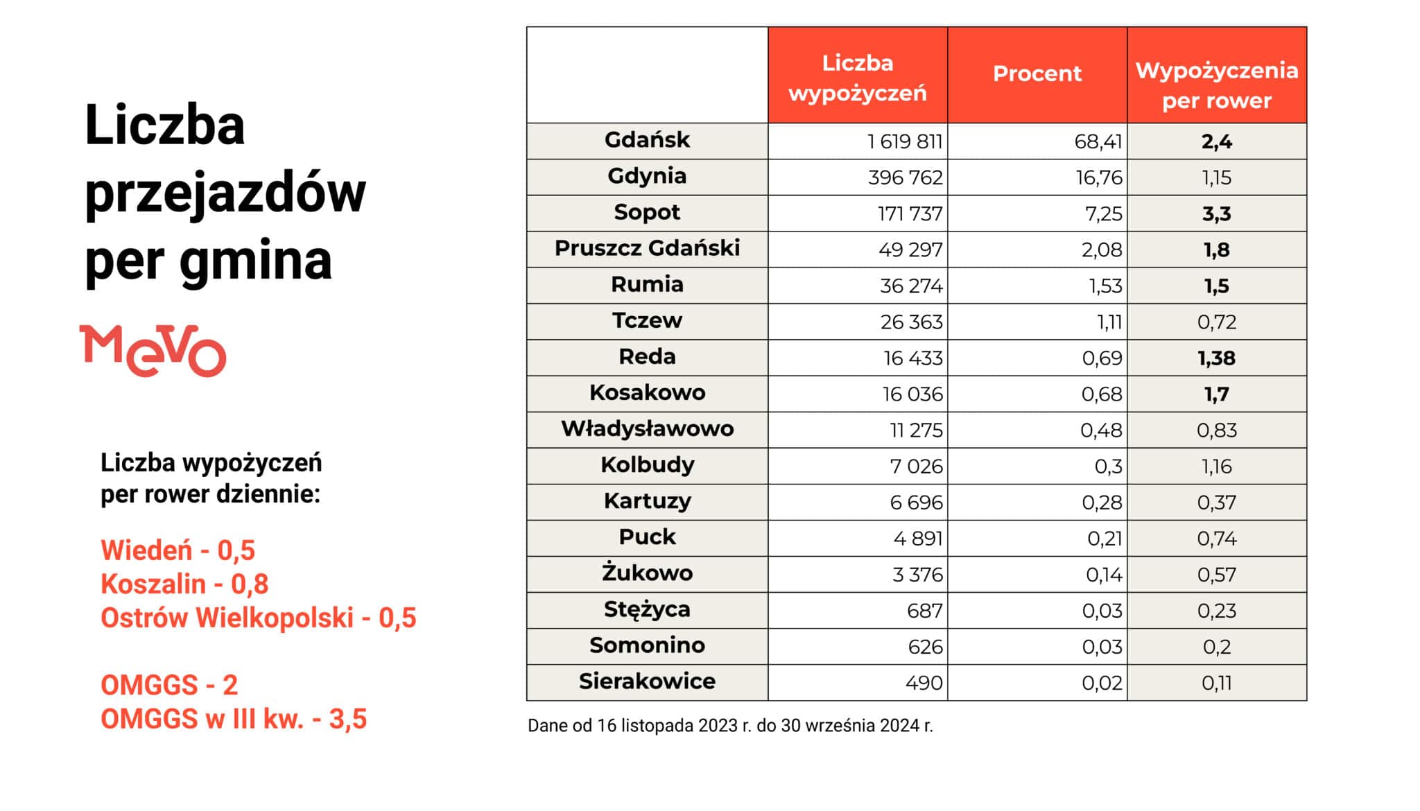 Od startu systemu 16 listopada 2023 roku do końca września 2024 roku, Mevo odnotowało aż 2,4 miliona podróży, pokonując przy tym 9 milionów kilometrów. Pruszcz Gdański zajmuje czwarte miejsce w rankingu gmin pod względem liczby wypożyczeń – 49 297 przejazdów, co stanowi 2,08 proc. wszystkich podróży wykonanych w systemie Mevo.