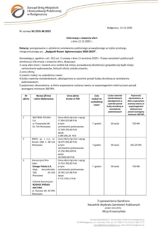 - Nextbike Polska zaproponował 12 509 370,60 zł brutto za zakres podstawowy,