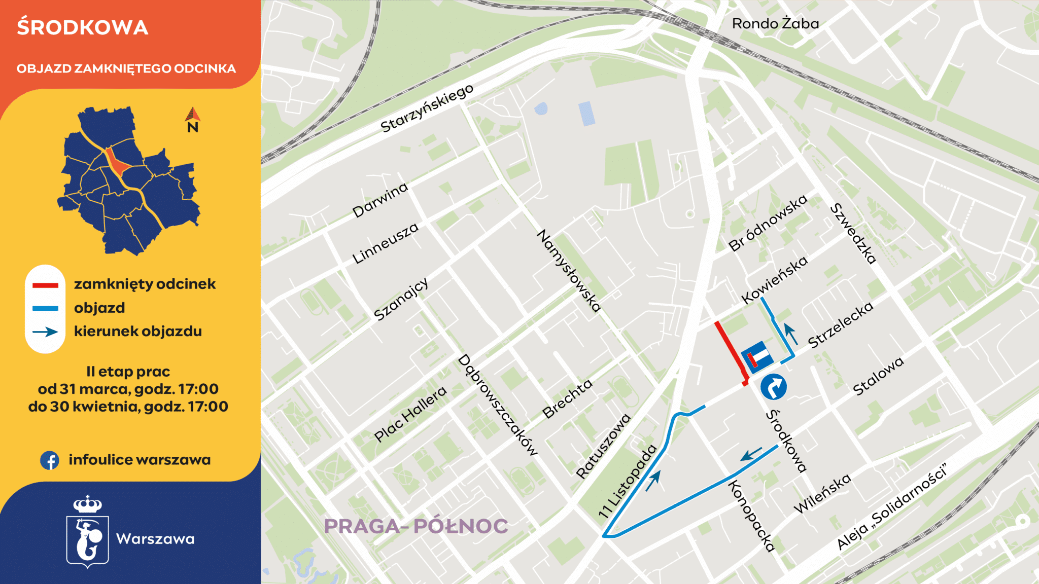 Pierwszy etap robót obejmuje odcinek od Kowieńskiej do Strzeleckiej i rozpoczął się 25 lutego o godz. 7:00. Odcinek został zamknięty dla ruchu, a przez skrzyżowanie Środkowej i Strzeleckiej kierowcy przejadą wyłącznie od Stalowej w stronę 11 Listopada. Piesi w tym etapie korzystają z chodnika po nieparzystej stronie ulicy.