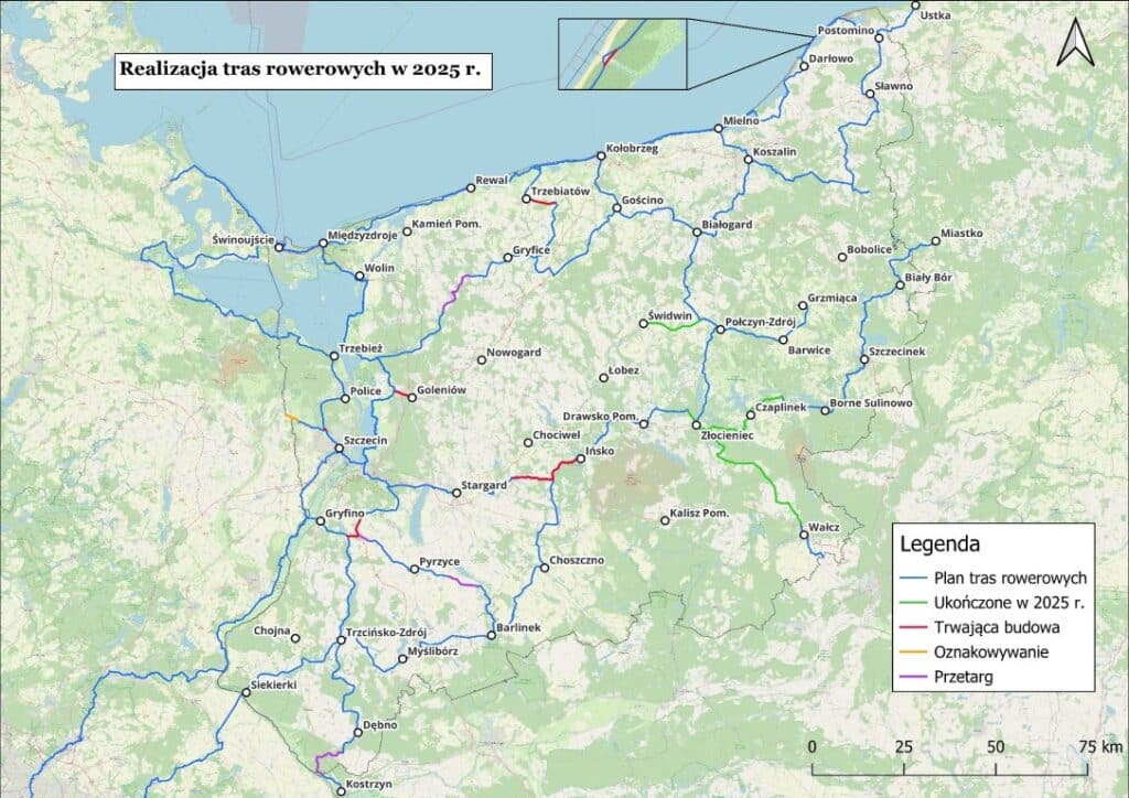 Równolegle w 2025 roku prowadzona była realizacja niemal 50 km tras rowerowych oraz ponad 40 km nowych odcinków w budowie. Prace objęły m.in. Trasę Doliny Płoni, Trasę Pojezierzy Zachodnich oraz fragmenty w Szczecinie pomiędzy Jeziorem Głębokim a Jeziorem Goplaną. Istotnym uzupełnieniem sieci jest także łącznik Blue Velo na odcinku Goleniów – Modrzewie, który wzmacnia spójność regionalnych korytarzy rowerowych.