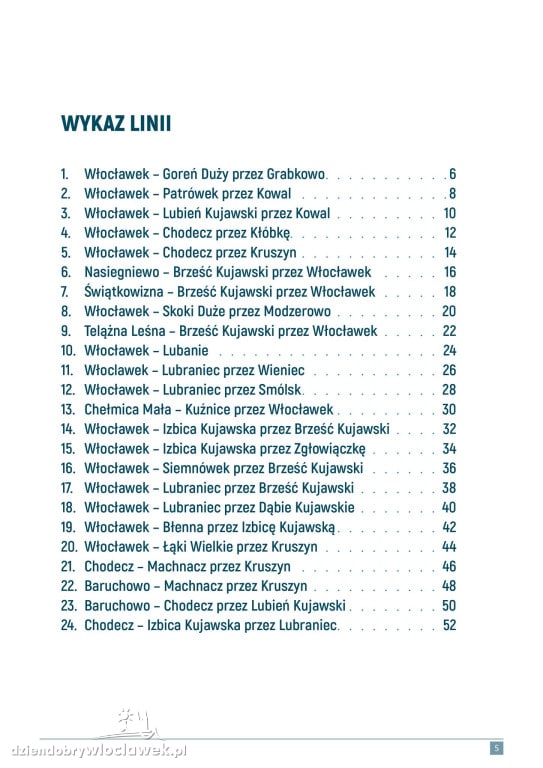 Nowy system transportu publicznego obejmuje 24 linie autobusowe, które łączą wszystkie gminy powiatu z Włocławkiem, a także tworzą bezpośrednie relacje pomiędzy wybranymi miejscowościami, bez konieczności przesiadki w mieście. Autobusy docierają m.in. do Lubrańca, Izbicy Kujawskiej, Chodcza, Brześcia Kujawskiego, Kowala, Kruszyna, Lubania i Lubienia Kujawskiego, a także do mniejszych miejscowości, takich jak Kuźnice, Chełmica Mała, Telążna Leśna, Nasiegniewo czy Świątkowizna.