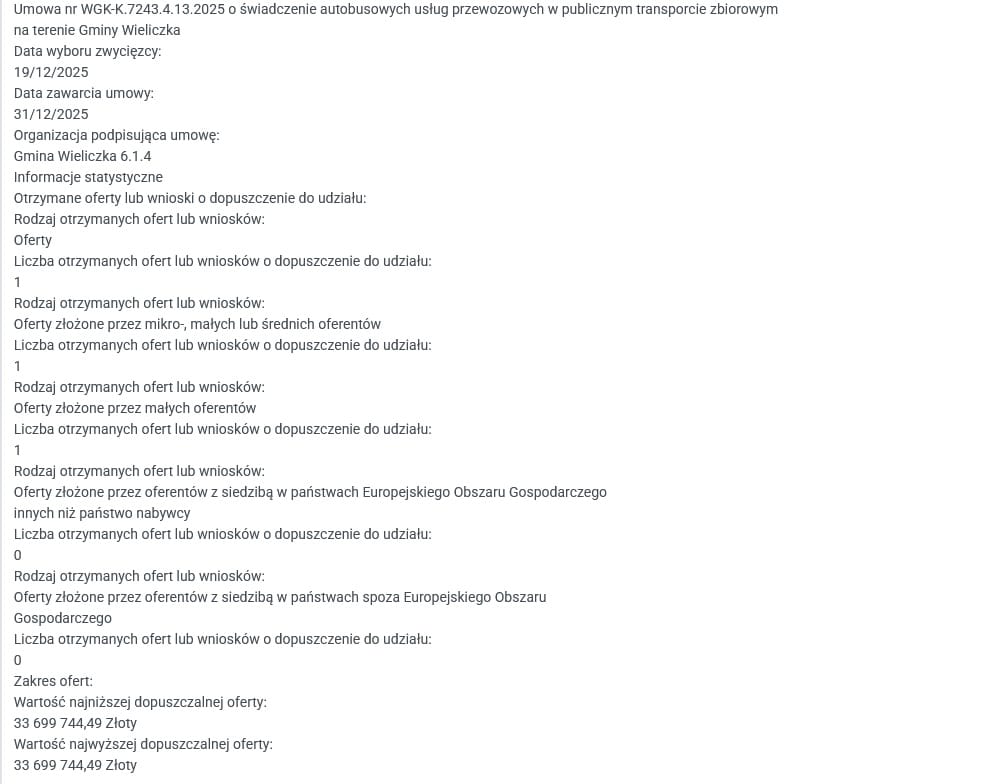 Postępowanie zakończyło się wyborem Wielickiej Spółki Transportowej Sp. z o.o., czyli podmiotu w 100% należącego do Gminy Wieliczka. W praktyce oznaczało to brak konkurencyjnych ofert, ale jednocześnie pełną kontrolę samorządu nad realizacją usług. Mocną stroną zwycięskiej oferty była znajomość lokalnej sieci komunikacyjnej, zaplecze techniczne oraz doświadczenie w obsłudze autobusowego transportu publicznego na terenie gminy. Słabszym elementem – z perspektywy rynku – był brak porównania cenowego, jednak w formule in-house nie miało to wpływu na końcowy wynik. O zwycięstwie przesądziło spełnienie wszystkich przesłanek ustawowych, w tym kontroli właścicielskiej oraz struktury działalności spółki.