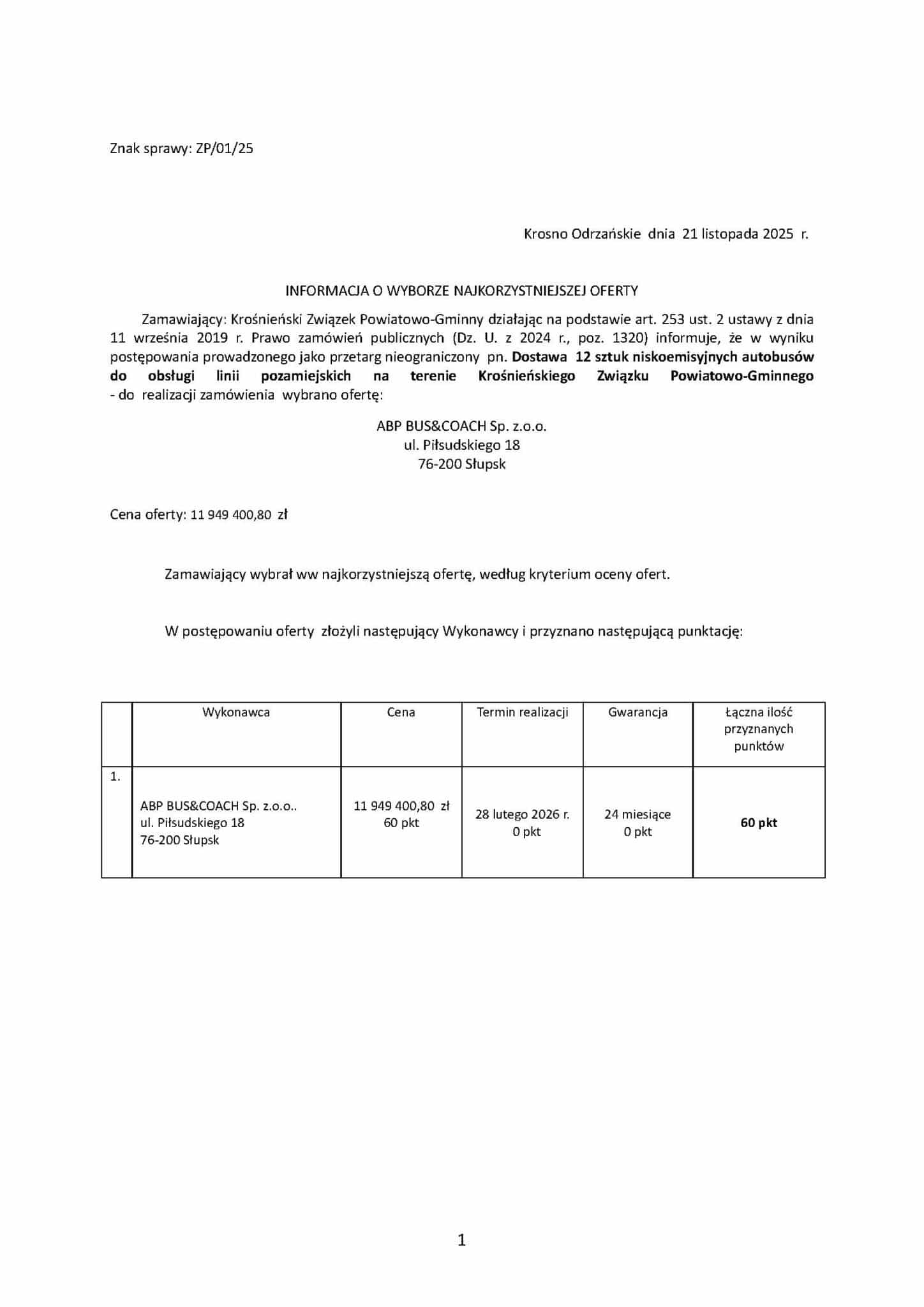Związek wybrał ofertę ABP BUS&COACH Sp. z o.o. opiewającą na 11.949.400,80 PLN brutto, co daje 9.712.520,16 PLN netto, a jednostkowo 809.376 PLN netto za jeden autobus niskoemisyjny, co daje cenę jednostkową netto na poziomie 809.376 PLN netto.