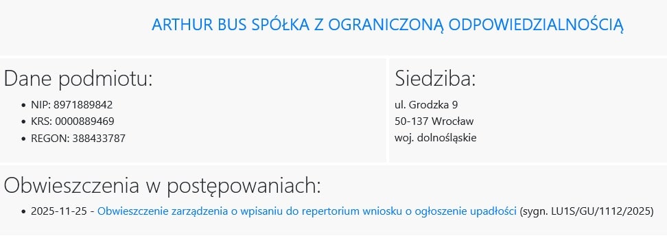 Tak wynika z pisma przesłanego do Sądu Rejonowego Lublin-Wschód. Poniżej obwieszczenie o wpisaniu sprawy do repertorium GU, które ukazało się 25 listopada 2025 r. Wniosek został złożony dzień wcześniej przez spółkę Arthur Bus zarejestrowaną przy ul. Grodzkiej 9 we Wrocławiu.