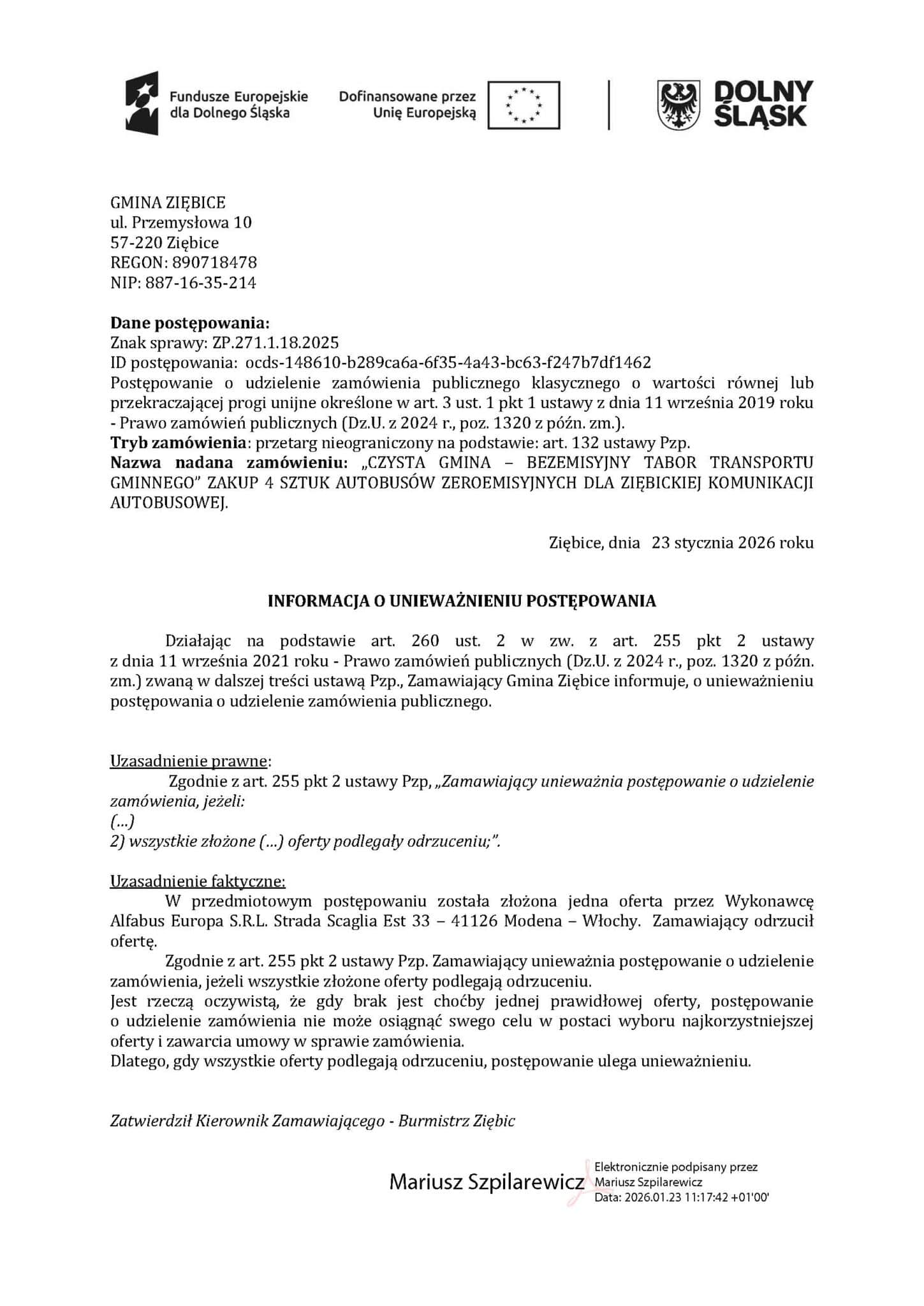 23 stycznia 2026 roku Gmina Ziębice juz po raz drugi unieważniła postępowanie na zakup czterech autobusów elektrycznych wraz z infrastrukturą ładowania.