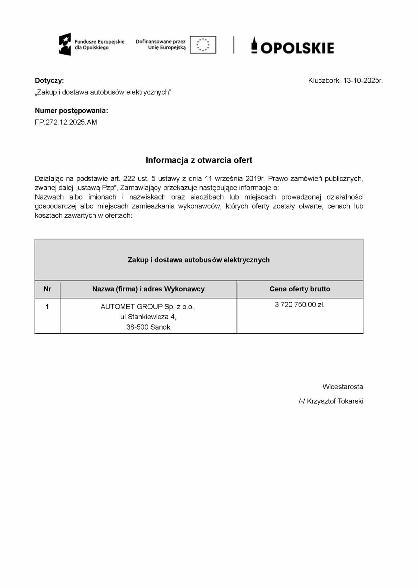 13 października 2025 roku w Starostwie Powiatowym w Kluczborku otwarto oferty w przetargu na zakup i dostawę autobusów elektrycznych.