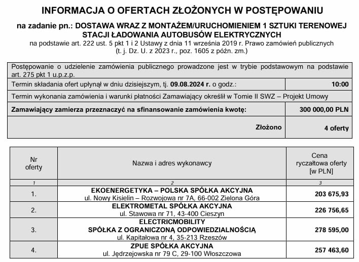 Zamawiający otrzymał oferty aż od czterech firm, co pokazuje, że ta branża przezywa rozkwit. Zamówienie dofinansowane jest z Narodowego Funduszu Ochrony Środowiska i Gospodarki Wodnej w ramach realizacji przedsięwzięcia pod nazwą: „Zakup autobusów elektrycznych i budowa infrastruktury ładowania w Jeleniej Górze”. Termin realizacji zamówienia został określony do 4 miesięcy od daty zawarcia umowy z wykonawcą.