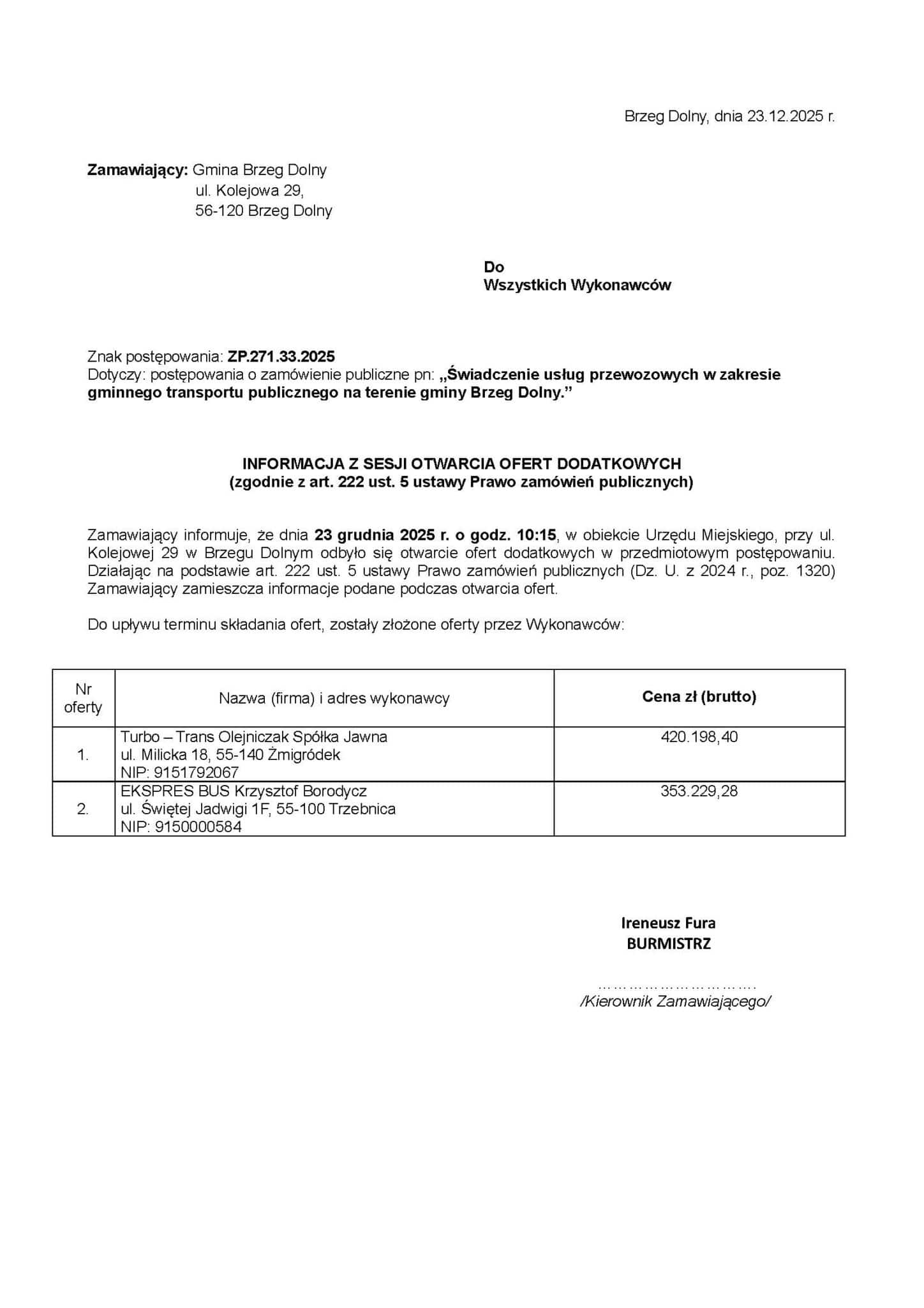 23 grudnia 2025 roku Gmina Brzeg Dolny ogłosiła wybór najkorzystniejszej oferty w postępowaniu na świadczenie usług przewozowych w zakresie gminnego transportu publicznego w 2026 roku.
