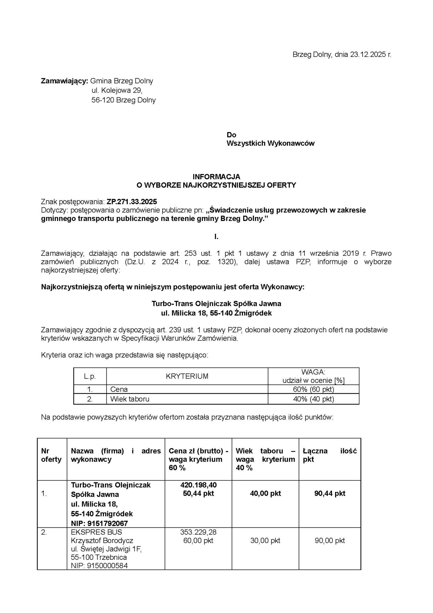 Ostateczna analiza punktowa pokazała, jak wyrównana była rywalizacja. EKSPRES BUS Krzysztof Borodycz uzyskał maksymalne 60 punktów za cenę, jednak w kryterium wieku taboru otrzymał 30 punktów, co dało łącznie 90,00 pkt. Z kolei Turbo-Trans Olejniczak Spółka Jawna zdobył 50,44 pkt za cenę, ale maksymalne 40 pkt za wiek taboru, co przełożyło się na 90,44 pkt łącznie. O zwycięstwie zdecydowała więc minimalna różnica 0,44 punktu, wynikająca z lepszej oceny nowoczesności pojazdów oferowanych przez Turbo-Trans.