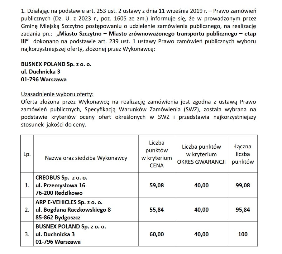 Mimo, że to warmińsko-mazurskie zamówienie nie jest było jakieś specjalnie duże, zgłosiło się do niego aż trzech chętnych: ARP, Busnex i Creobus. Dodajmy, że zaoferowane pojazdy – z przeznaczeniem do regularnej komunikacji miejskiej – mają być dostarczone razem z ładowarkę mobilną mocy 40kW. Wszystko to w ramach projektu „Miasto Szczytno – Miasto zrównoważonego transportu publicznego – etap III” w ramach programu „Zielony Transport Publiczny”.