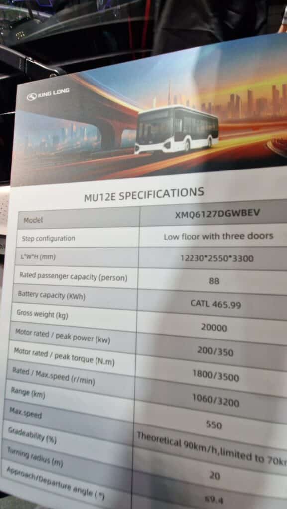 Nowy model MU12E to 12-metrowy, niskopodłogowy autobus elektryczny, zaprojektowany od podstaw z myślą o intensywnej eksploatacji miejskiej. Zastosowano w nim nową generację baterii CATL BC5 Mark 2 o całkowitej pojemności 465,99 kWh, które zapewniają nawet do 550 kilometrów realnego zasięgu. Bateria wyróżnia się poprawioną stabilnością cieplną, szybkim ładowaniem i długą żywotnością. Dodatkowo oferowana jest z rozszerzoną gwarancją producenta.