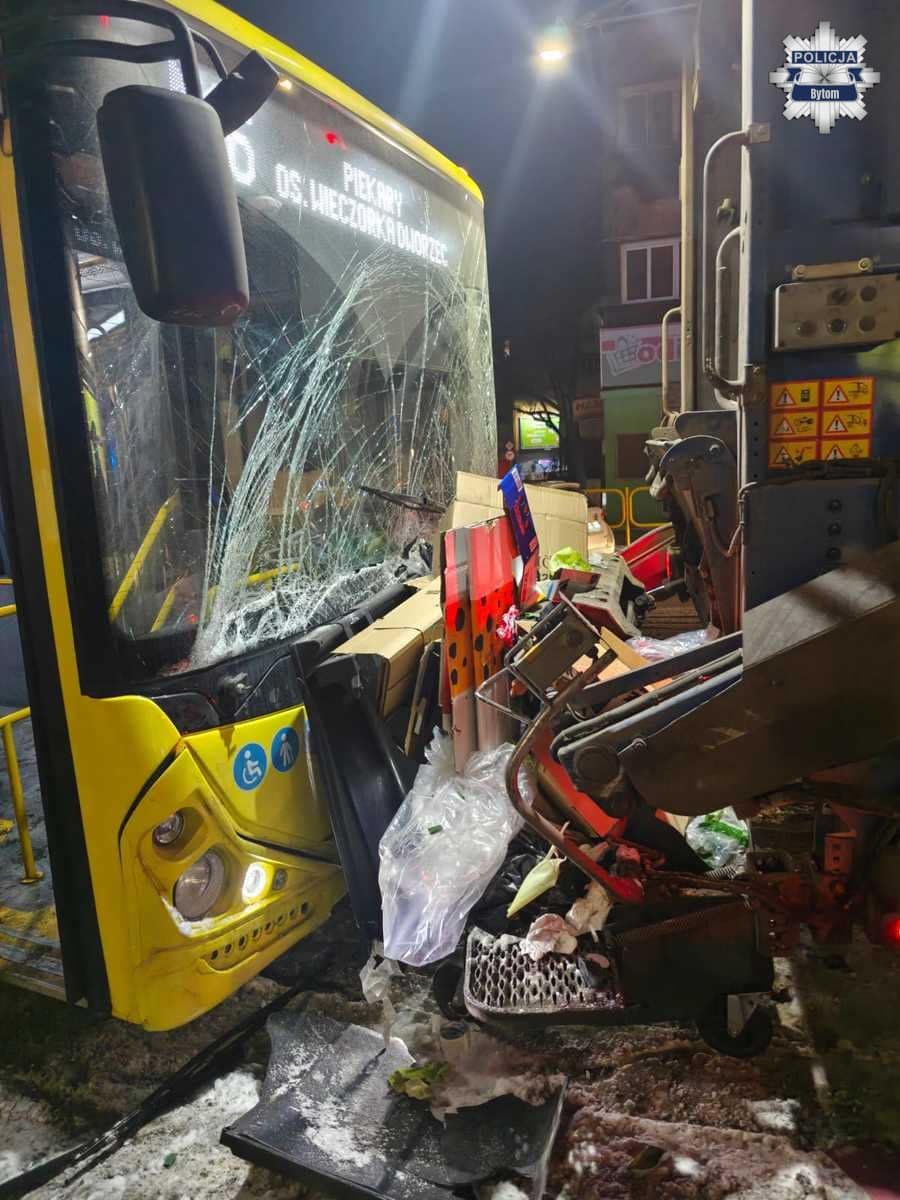 Do wypadku doszło w poniedziałek, 12 stycznia 2026 roku, wieczorem na ul. Witczaka w Bytomiu. W zdarzeniu brał udział autobus komunikacji miejskiej linii M16 (Gliwice – Piekary Śląskie), samochód osobowy marki Peugeot oraz śmieciarka wykonująca prace komunalne. Jak wynika ze wstępnych ustaleń policjantów, 52-letni kierowca autobusu nie zachował bezpiecznej odległości od jadącego przed nim samochodu osobowego.