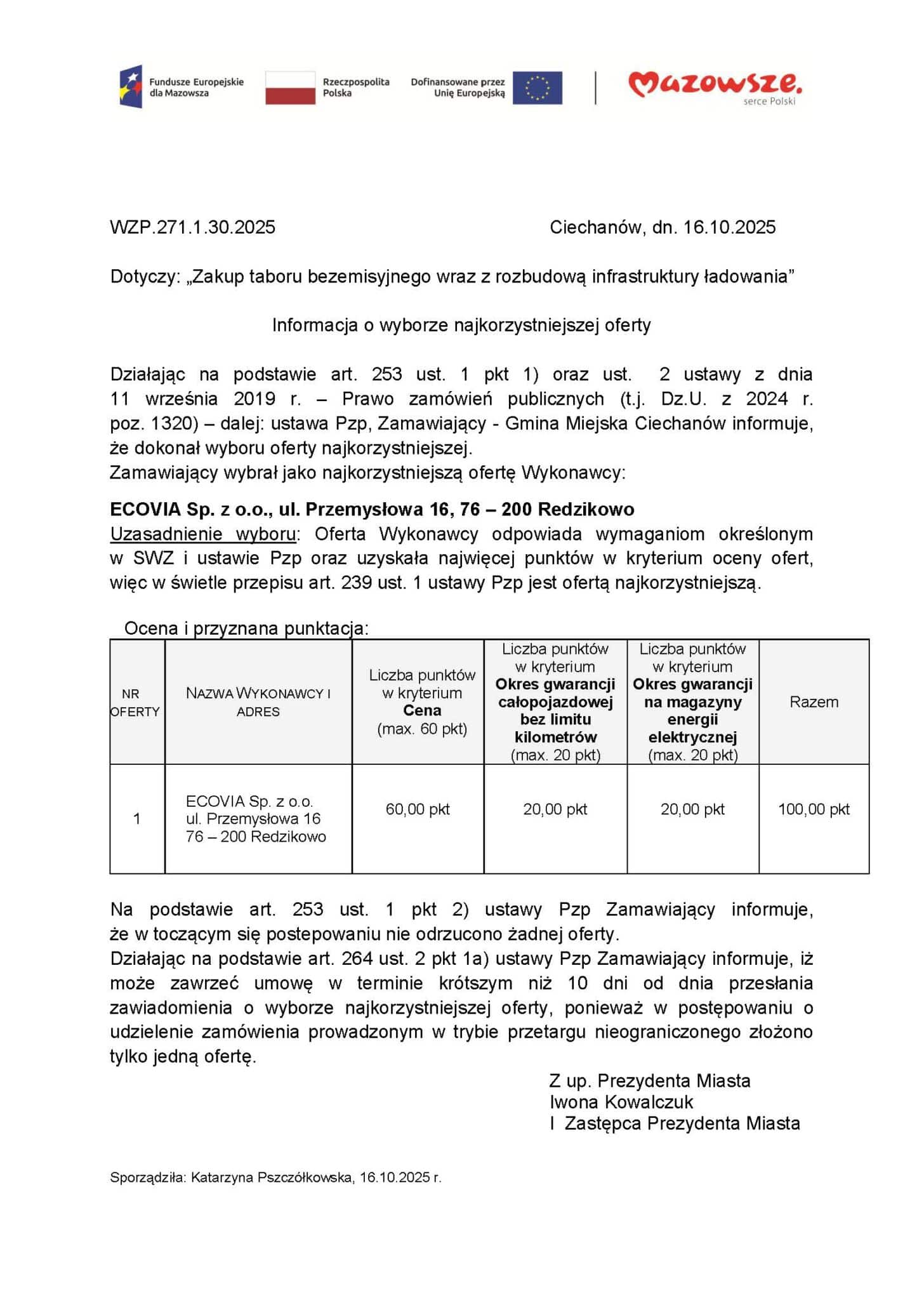 W ocenie komisji oferta uzyskała komplet 100 punktów, co potwierdza jej zgodność z warunkami. Szczegółowe informacje o zamówieniu na stronie: https://bip.umciechanow.pl/zamowienia_publiczne/powyzej_30/Zakup-taboru-bezemisyjnego-wraz-z-rozbudowa-infrastruktury-ladowania/idp:556