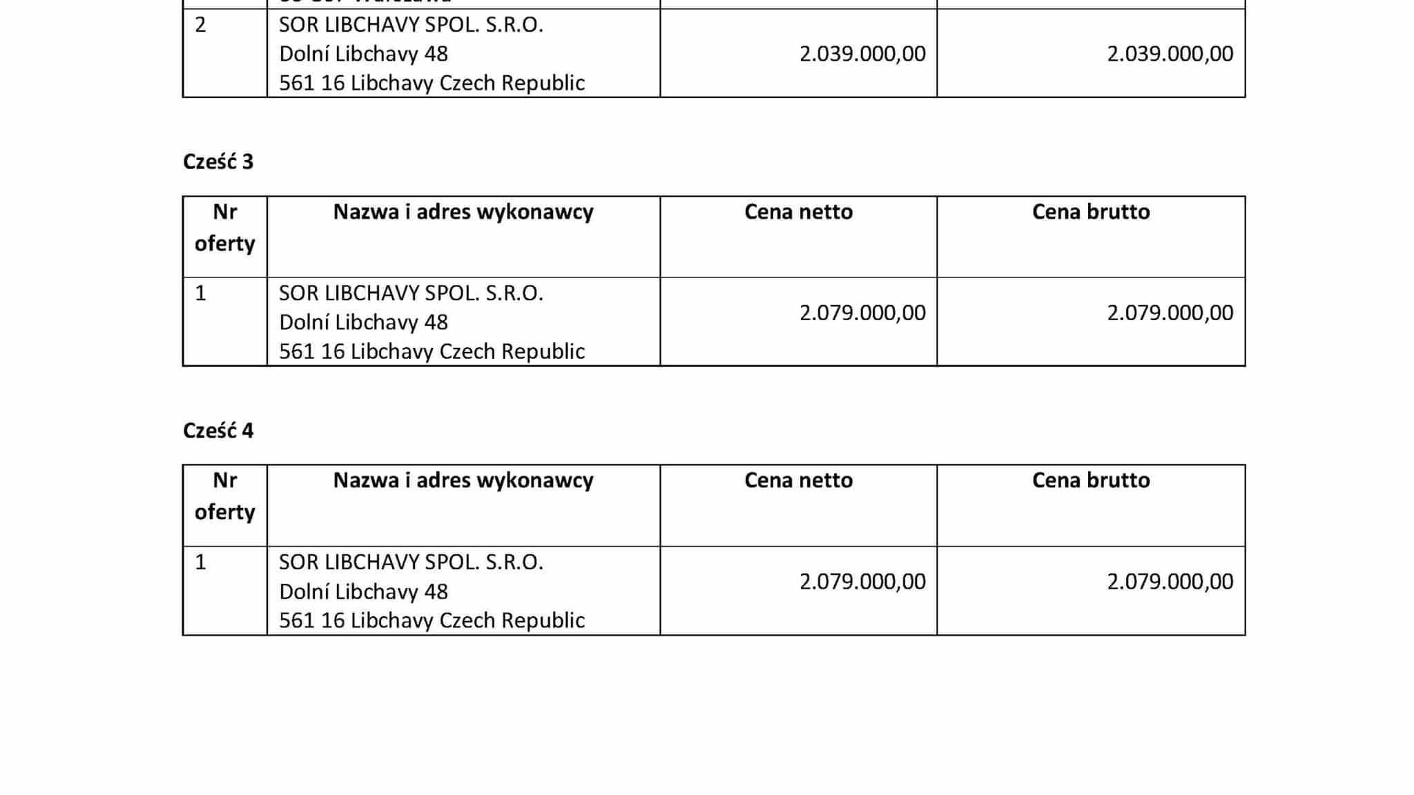 - SOR LIBCHAVY ponownie utrzymał cenę 2.039.000 PLN netto, co daje identyczną cenę jednostkową netto – prawdopodobnie za EBN 9,5.