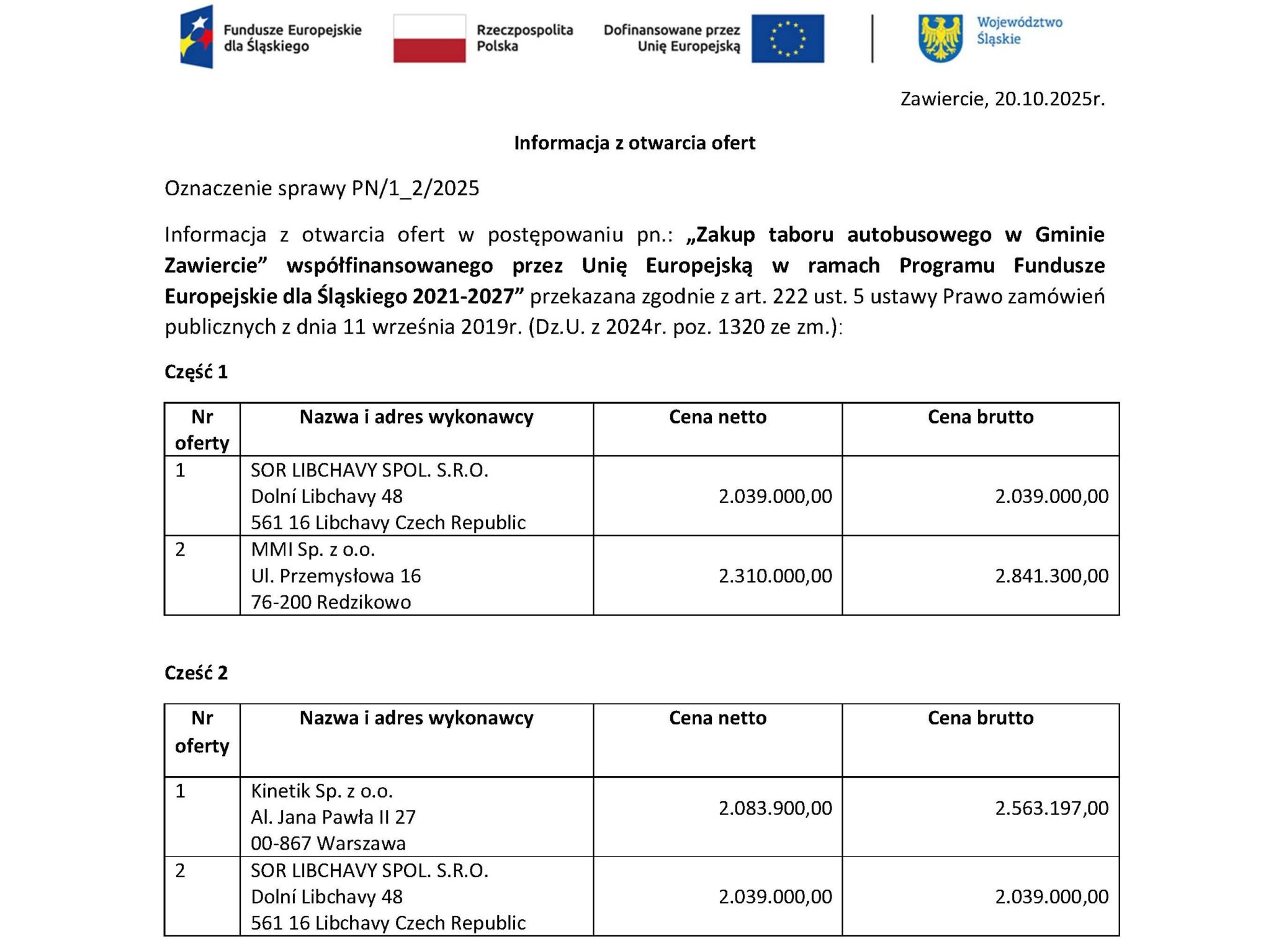 20 października 2025 roku poznaliśmy oferty w przetargu ogłoszonym przez Zakład Komunikacji Miejskiej w Zawierciu na dostawę czterech nowych elektrobusów.