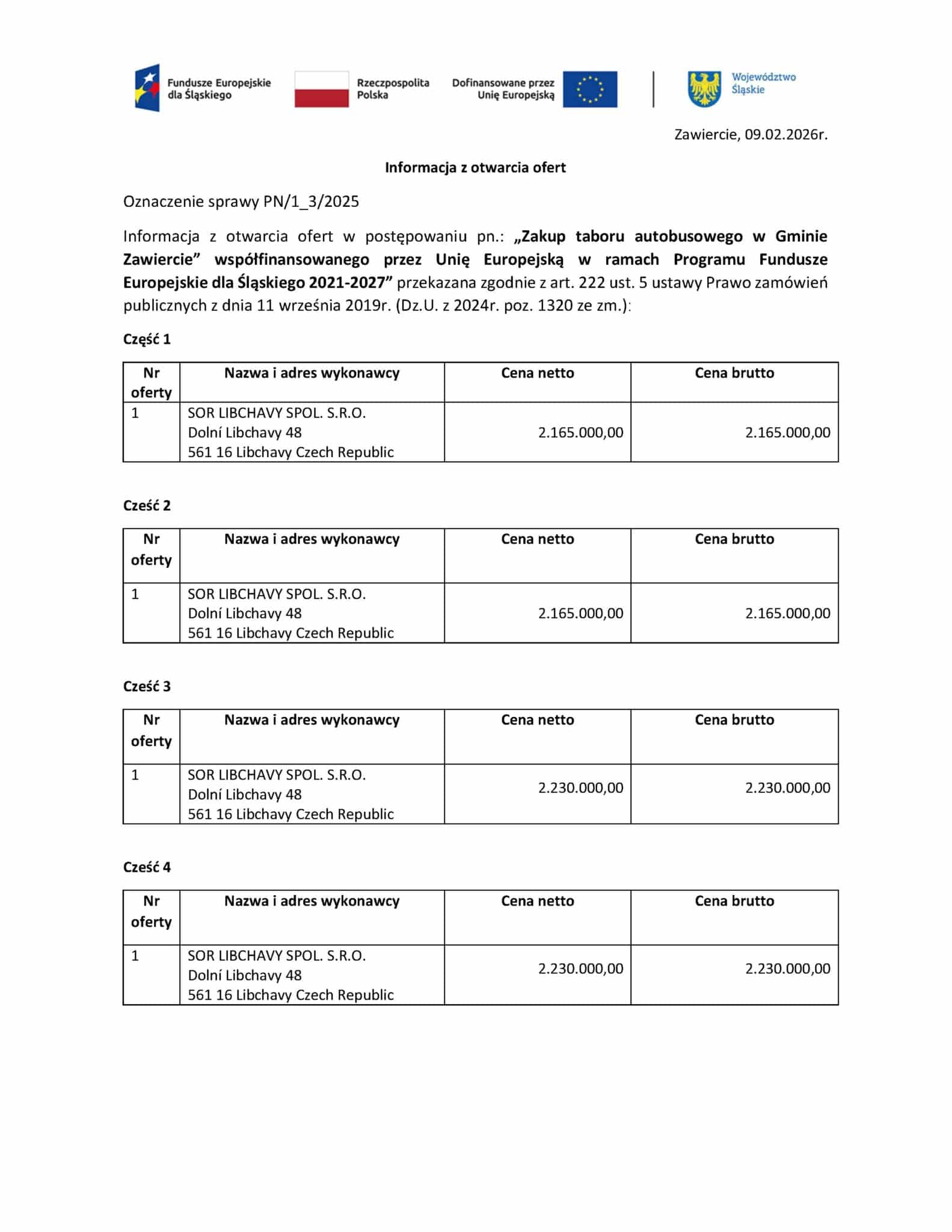 9 lutego 2026 roku Zakład Komunikacji Miejskiej w Zawierciu dokonał otwarcia ofert w trzecim podejściu na zakup autobusów elektrycznych dla komunikacji miejskiej.