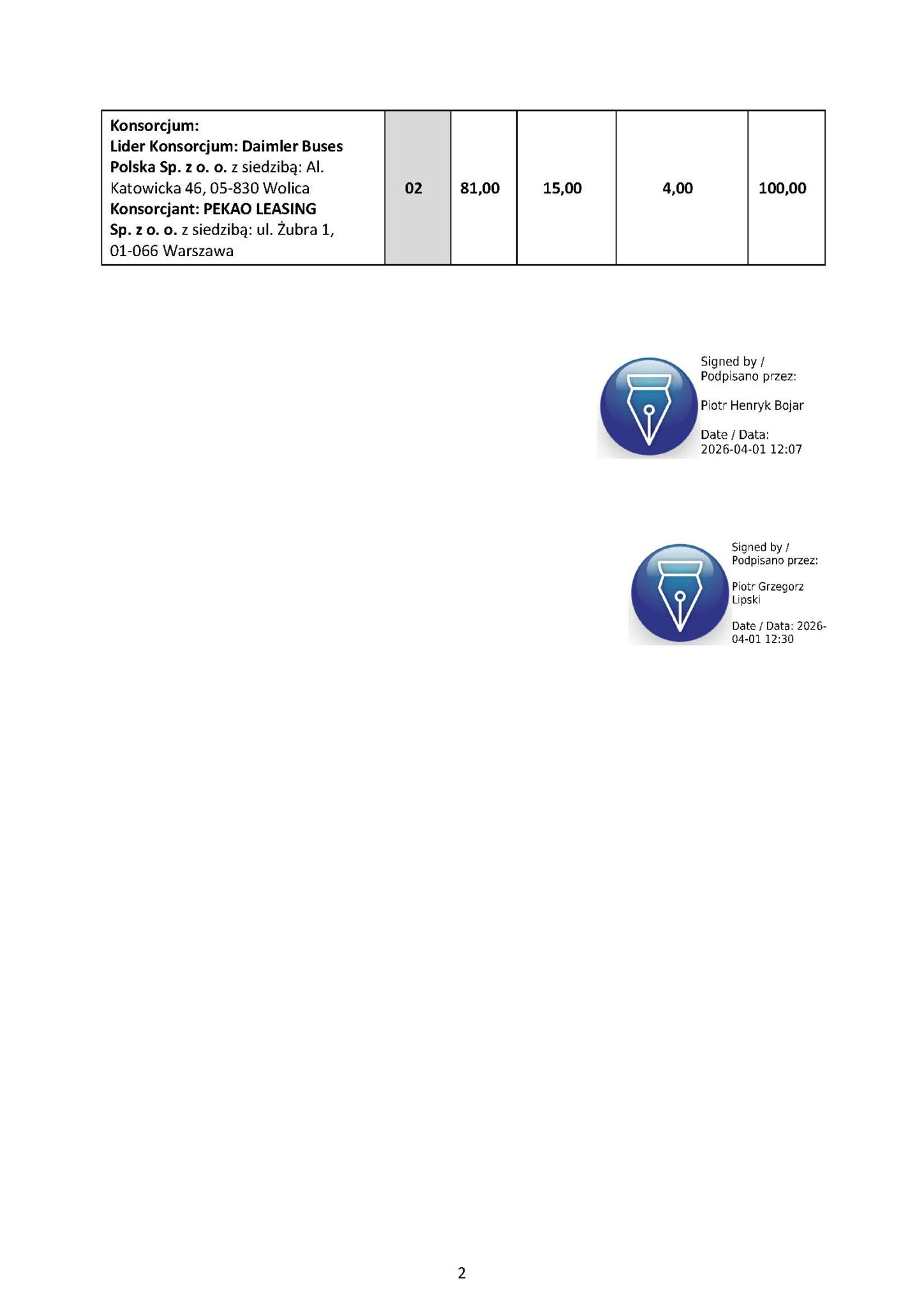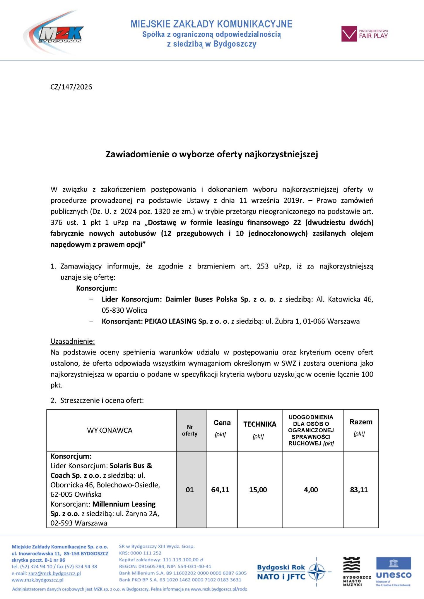 W tej sytuacji najkorzystniejszą ofertę złożyło konsorcjum: Daimler Buses Polska + Pekao Leasing. Propozycja ta uzyskała maksymalną ocenę 100 punktów, spełniając wszystkie wymagania zamawiającego i osiągając najwyższy wynik w kryteriach oceny. Wartość zamówienia podstawowego wynosi 54.702.241,36 PLN brutto za modele Mercedes-Benz Conecto.