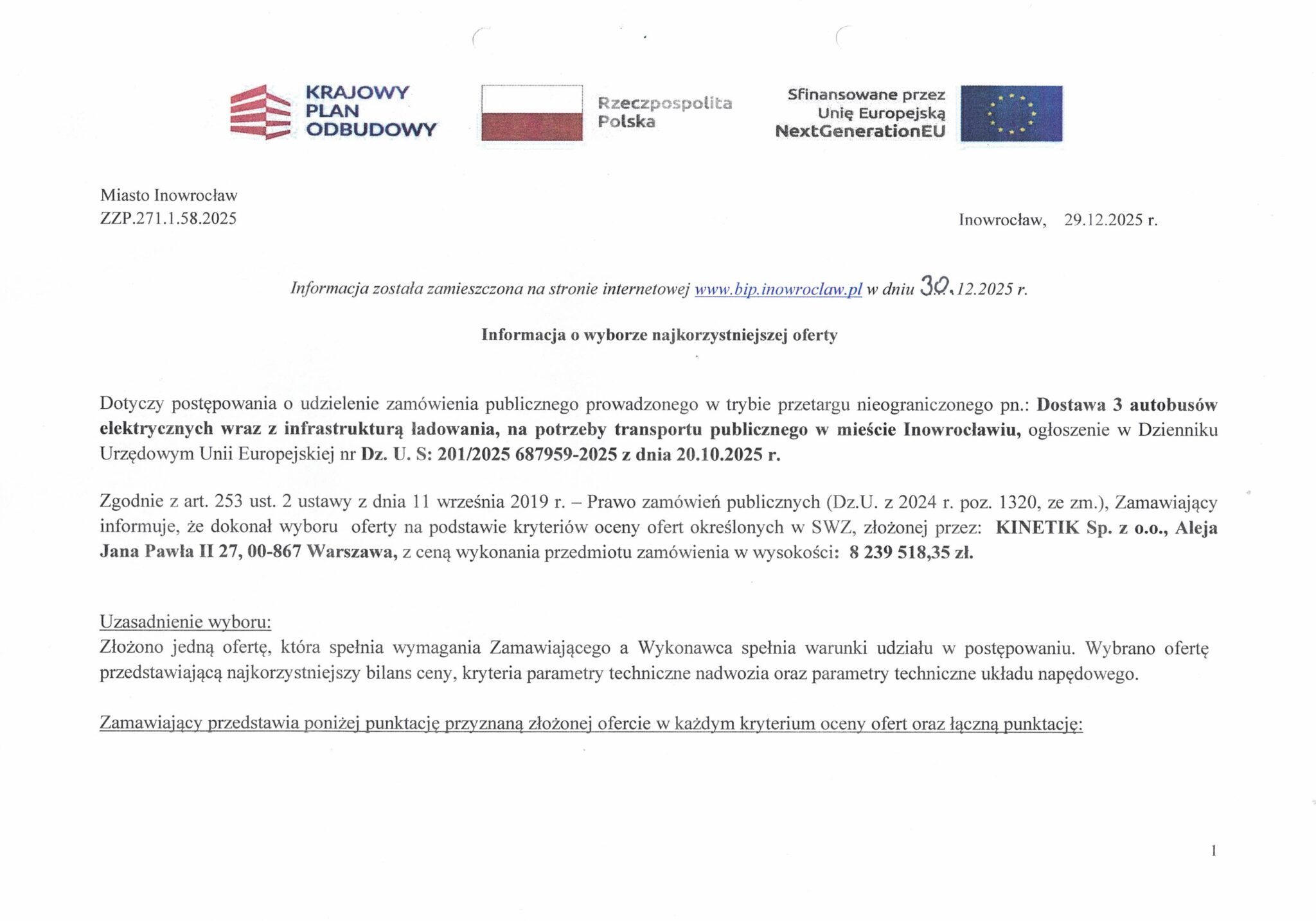 29 grudnia 2025 roku Miasto Inowrocław dokonało wyboru najkorzystniejszej oferty w trzecim już postępowaniu na dostawę elektrobusów MINI i MIDI wraz z infrastrukturą ładowania.