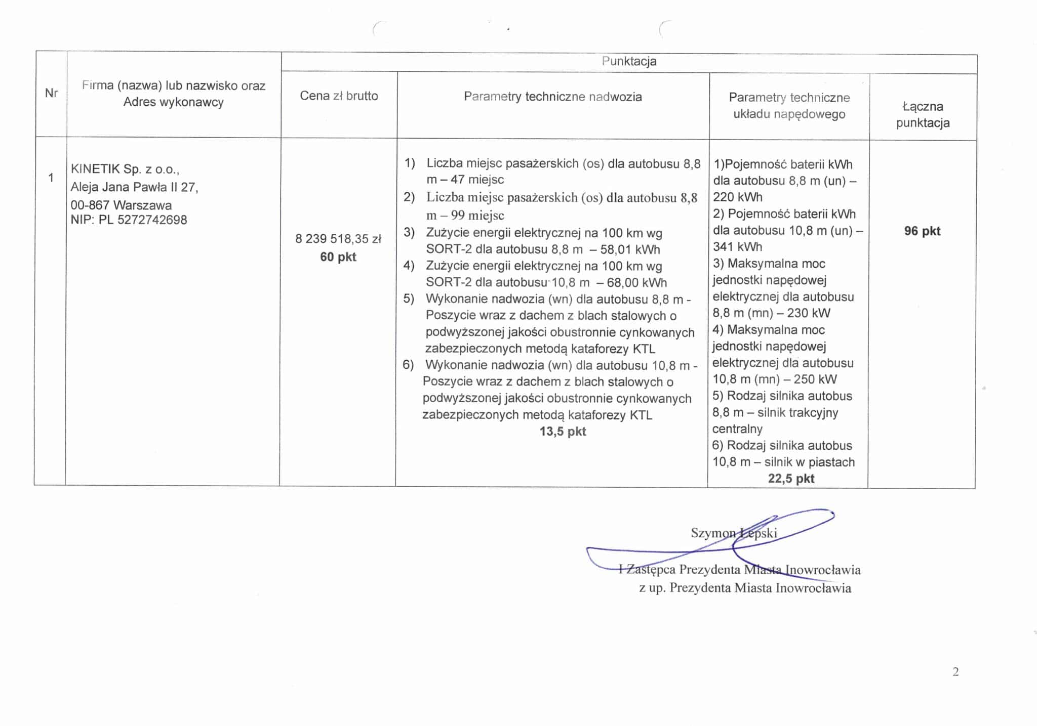 KINETIK Sp. z o.o. zaproponował realizację zamówienia za 8.239.518,35 PLN brutto, co odpowiada 6.697.175,89 PLN netto. Oznacza to średnią cenę jednostkową na poziomie 2.232.392 PLN netto za jeden autobus elektryczny Karsan e-JEST i Karsan e-ATAK. Z kolei kwota przewidziana przez miasto na realizację zamówienia wynosiła 8.393.000 PLN brutto, a więc oferta zmieściła się w budżecie i była od niego niższa o ponad 150.000 PLN. To zasadnicza różnica w porównaniu z wcześniejszym postępowaniem, w którym cztery elektrobusy wyceniono na ponad 10.439.651,95 PLN brutto, co przekraczało możliwości finansowe Inowrocławia.