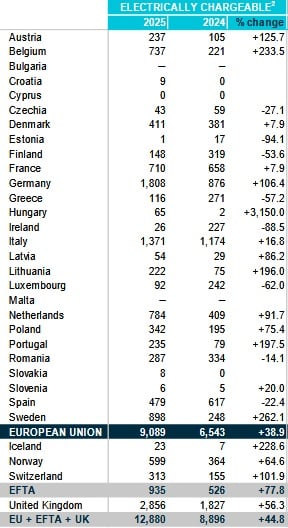 To spadek o 880 pojazdów, czyli -24,9% r/r. Udział hybryd w rynku obniżył się do 7,0%, co jasno pokazuje, że technologia ta traci na znaczeniu jako rozwiązanie przejściowe pomiędzy dieslem a pełną elektryfikacją. Segment autobusów hybrydowych zanotował w 2025 r. wyraźny regres niemal we wszystkich krajach UE. Spadki sięgały: