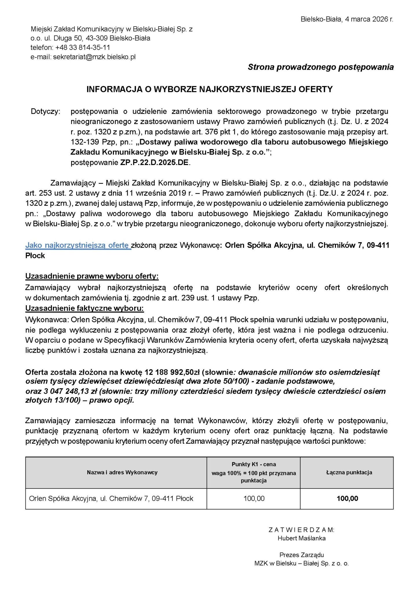 Najkorzystniejszą ofertę złożyła Orlen Spółka Akcyjna, która została wybrana na podstawie kryterium ceny (waga 100%).