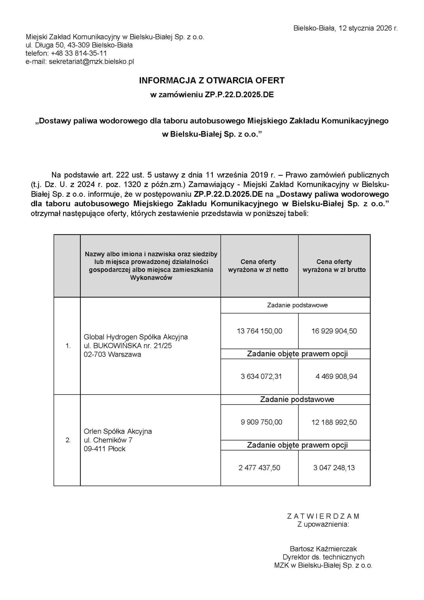 - Z kolei Global Hydrogen Spółka Akcyjna zaproponowała 16.929.904,50 PLN brutto / 13.764.150 PLN netto, co daje 76,47 PLN/kg netto. W opcji wychodzi 80,76 PLN/kg netto, więc oferta była nie tylko wyższa od Orlen, ale też mniej korzystna jednostkowo. Ostatecznie to oferta koncernu z Płocka uzyskała maksymalną ocenę.
