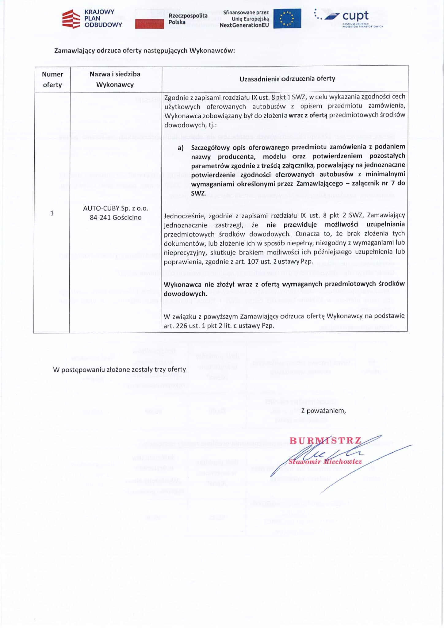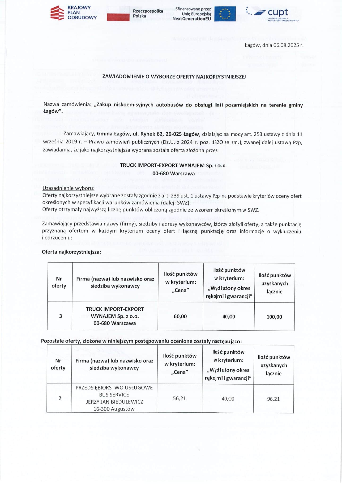 Zamówienie jest finansowane ze środków Krajowego Planu Odbudowy i Zwiększania Odporności, w ramach inwestycji: Zero- i niskoemisyjny transport zbiorowy. 👉 Szczegółowe we informacje o zamówieniu na: https://lagowgmina.ezamawiajacy.pl/pn/lagowgmina/demand/notice/public/168642/details