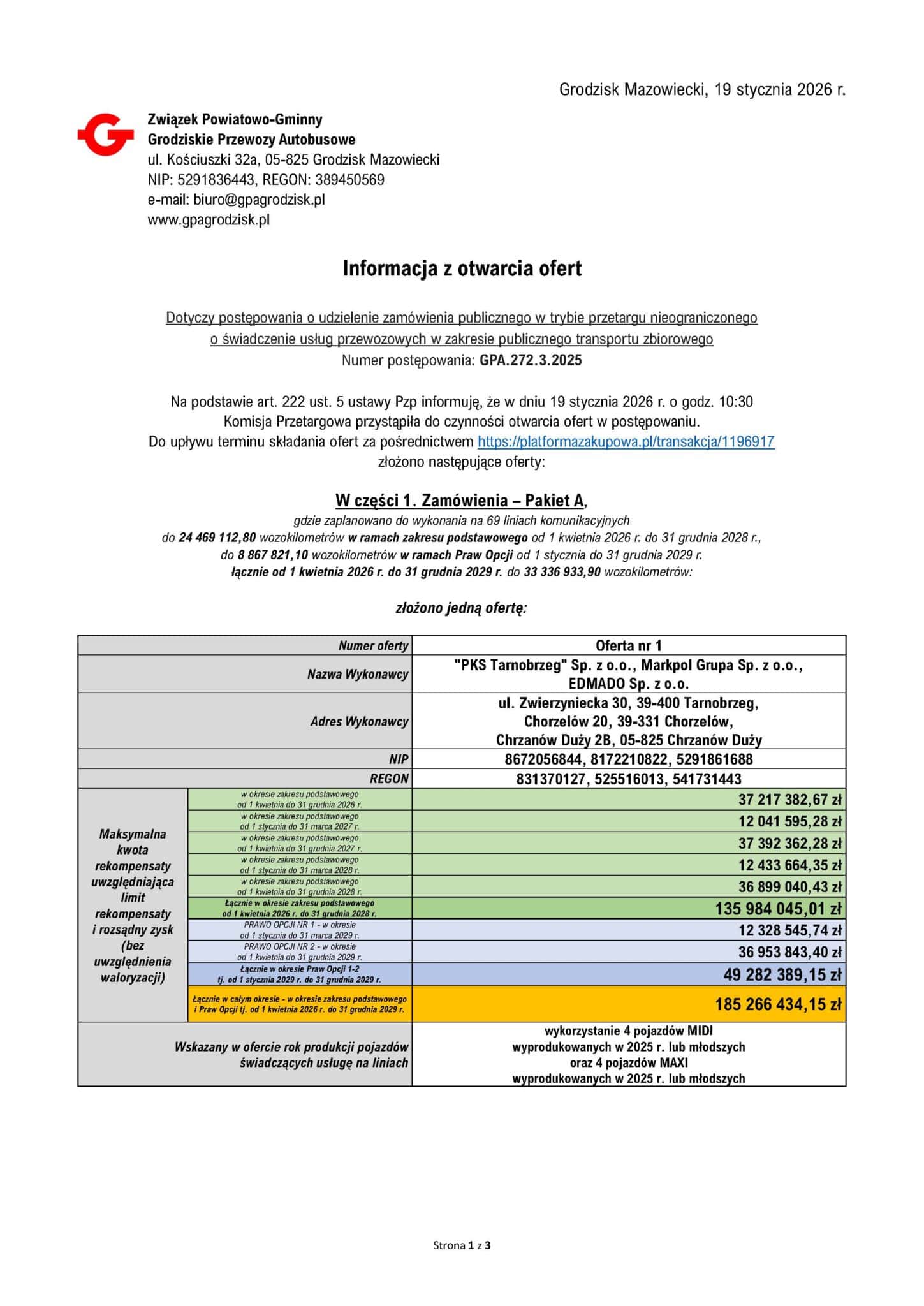 19 stycznia 2026 r. Związek Powiatowo-Gminny Grodziskie Przewozy Autobusowe otworzył oferty w jednym z największych postępowań na regionalny transport publiczny ostatnich lat.