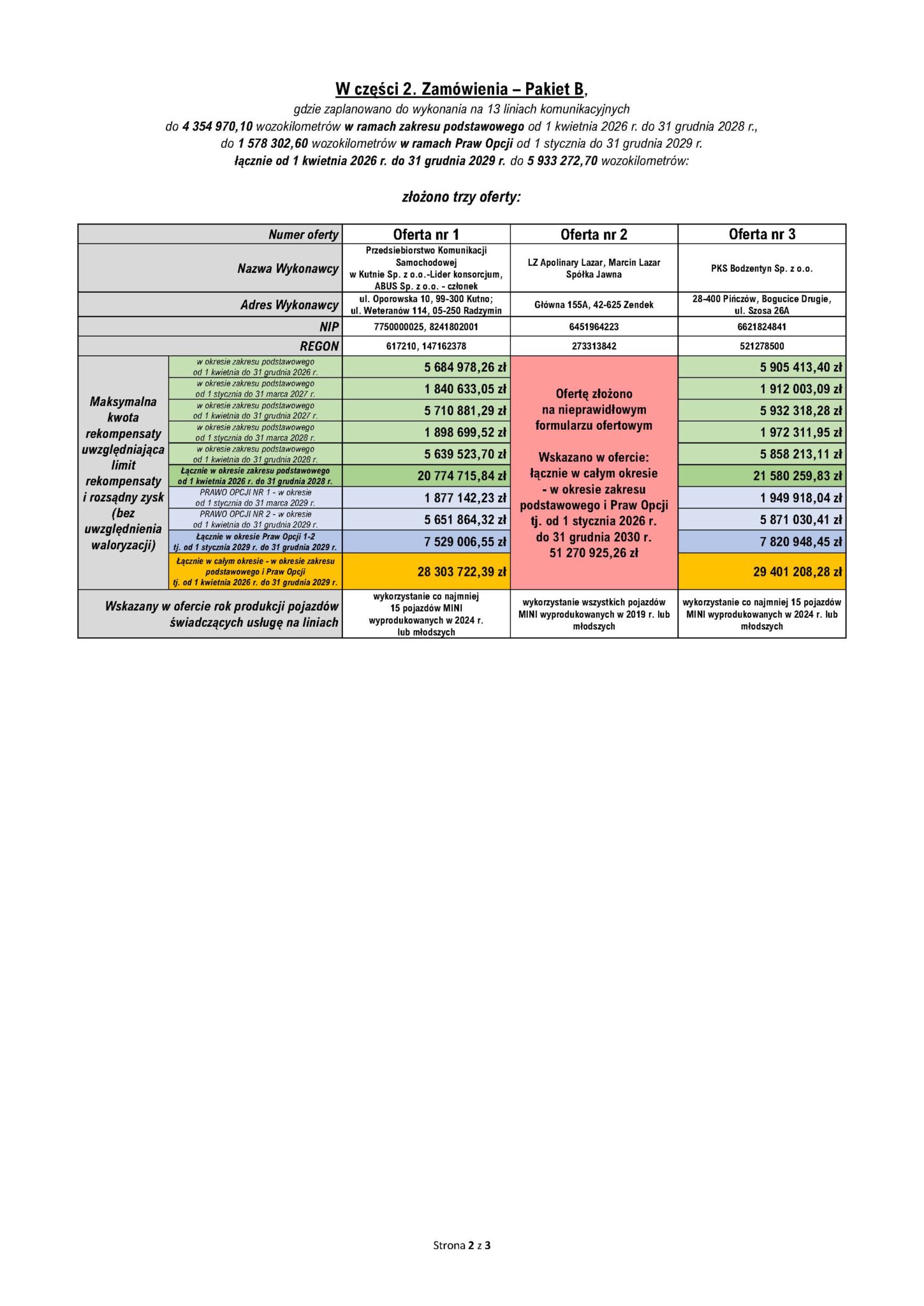W Pakiecie B konkurencja była największa. Najniższą cenowo ofertę złożyło konsorcjum Pks Kutno i Abus, proponując 28.303.722,39 PLN brutto za cały okres, co daje około 4,40 PLN netto za 1 wzkm. Druga oferta, złożona przez Lz Apolinary Lazar, Marcin Lazar Spółka Jawna, opiewa na 29.401.208,28 PLN brutto, czyli ok. 4,57 PLN netto za 1 wzkm. Trzecia propozycja Pks Bodzentyn została złożona na nieprawidłowym formularzu i już na etapie otwarcia budzi wątpliwości formalne. Budżet zamawiającego dla Pakietu B to 23.978.066,48 PLN, co oznacza, że wszystkie poprawne oferty przekraczają zaplanowaną kwotę.