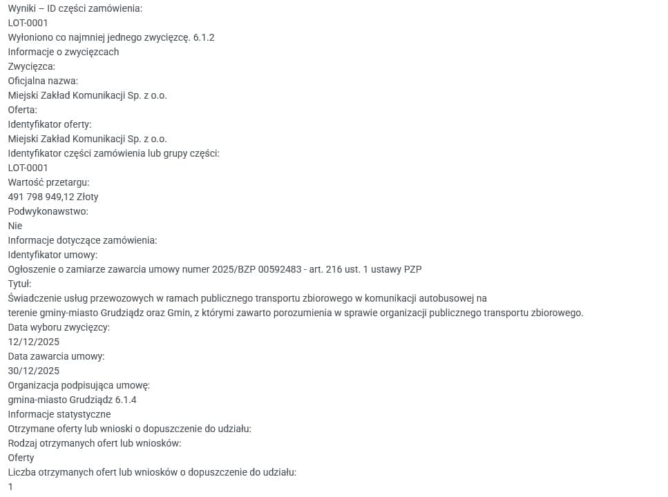 Zamówienie zostało udzielone w trybie zamówienia z wolnej ręki, jako powierzenie zadania operatorowi wewnętrznemu. Jedyną złożoną ofertę przedstawiła Miejski Zakład Komunikacji Sp. z o.o., będący w 100% własnością gminy–miasta Grudziądz. Wartość zawartej umowy wynosi 491.798.949,12 PLN brutto.