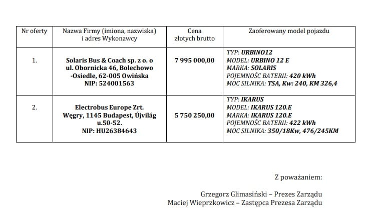 • Solaris Bus & Coach zaproponował model Urbino 12 electric z bateriami o pojemności 420 kWh i silnikiem o mocy 240 kW. Cena brutto wyniosła 7.995.000 PLN, co oznacza 6.500.000 PLN netto, a cena jednostkowa netto Urbino 12 electric kształtuje się na poziomie 3.250.000 PLN netto.
