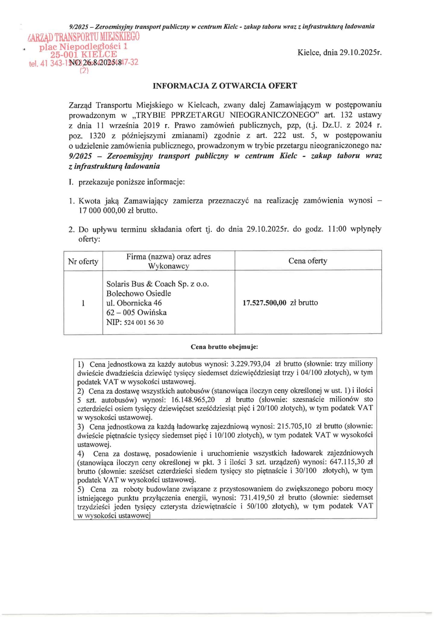 W zadanym terminie wpłynęła tylko jedna oferta – złożona przez Solaris Bus & Coach Sp. z o.o. na kwotę 17.527.500 PLN brutto, co odpowiada 14.250.000 PLN netto. Zgłoszenie obejmuje pięć autobusów elektrycznych wraz z infrastrukturą ładowania, co daje cenę jednostkową netto za premierowy model Solaris Urbino 10,5 electric na poziomie 2.850.000 PLN (przy założeniu proporcjonalnego podziału kosztów).