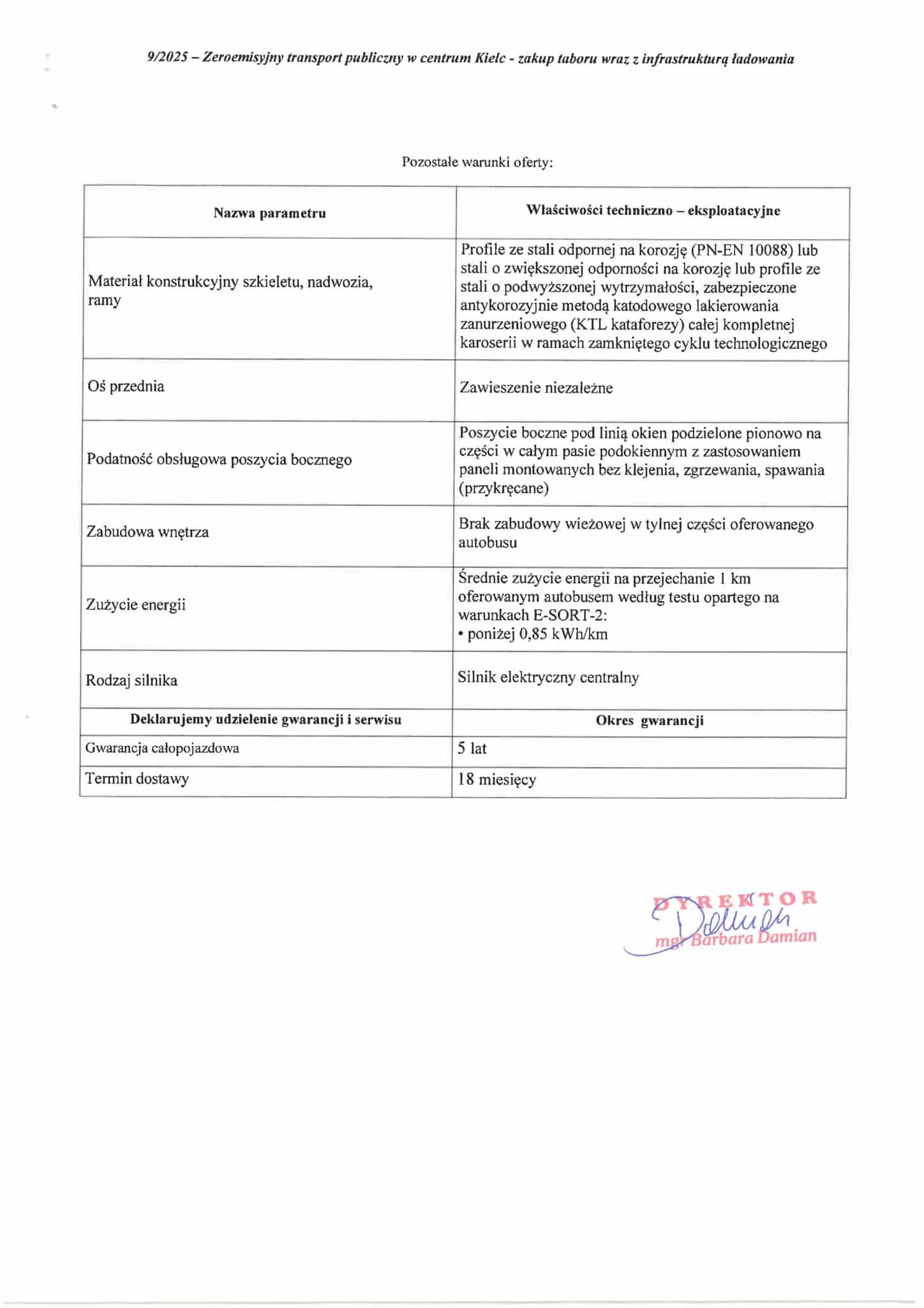 Zamawiający wprowadził do specyfikacji szereg szczegółowych wymagań, w tym preferencje dotyczące centralnego silnika elektrycznego o mocy min. 160 kW, baterii o pojemności nie mniejszej niż 320 kWh i zasięgu min. 250 km na jednym ładowaniu. Autobusy mają być ładowane wyłącznie przewodowo z wykorzystaniem zewnętrznych ładowarek typu plug-in. W konstrukcji pojazdu wymagany jest szkielet z profili stalowych zabezpieczonych metodą KTL, zawieszenie niezależne na osi przedniej, modułowe poszycie boczne i brak wieżowej zabudowy w tylnej części.