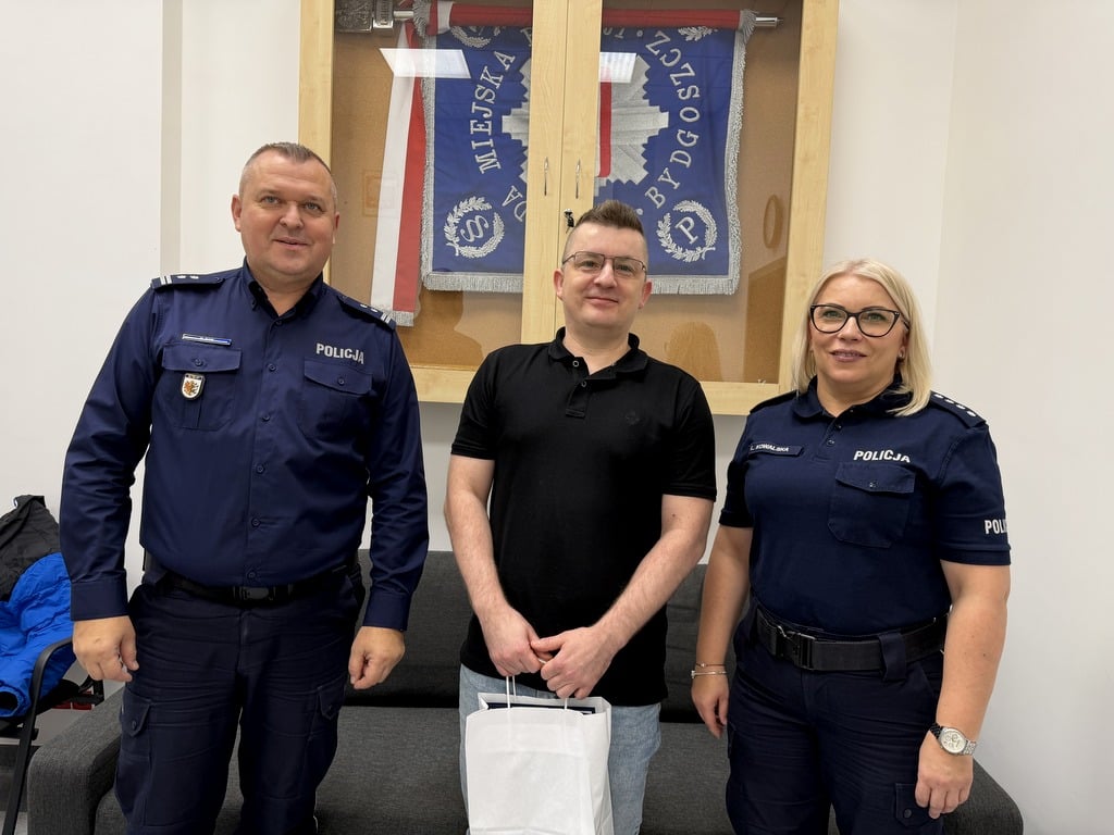 Za wzorowe działania, zimną krew i odpowiedzialność kierowca został uhonorowany przez Komendanta Miejskiego Policji w Bydgoszczy, mł. insp. Mariusza Gaika. Podczas spotkania w siedzibie KMP przekazano mu: