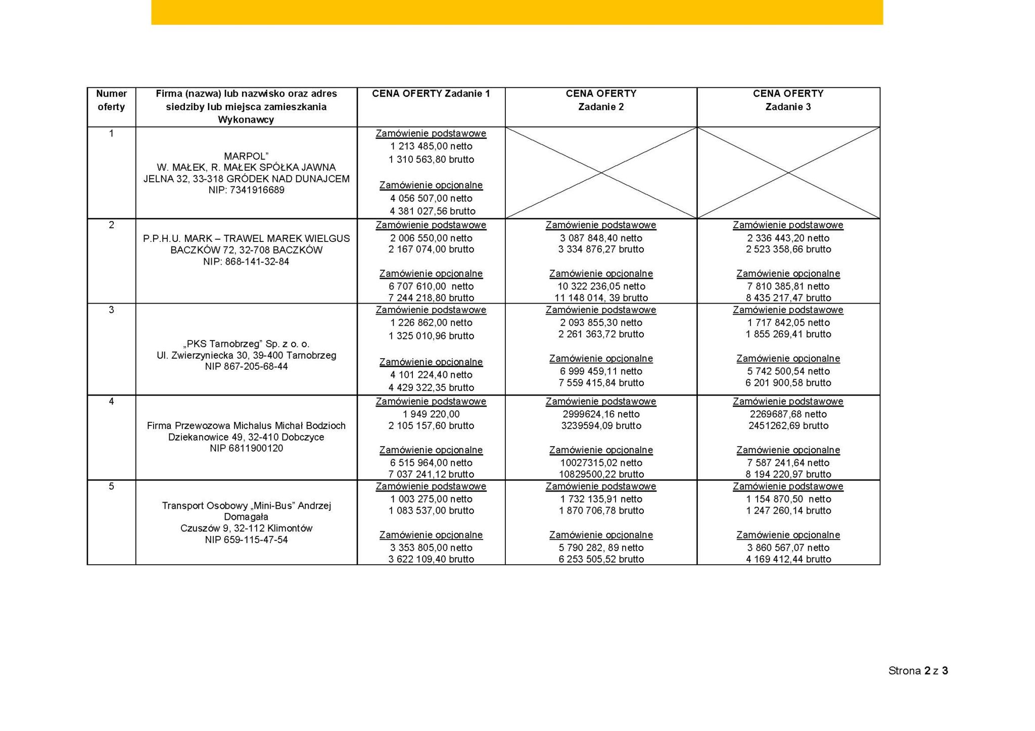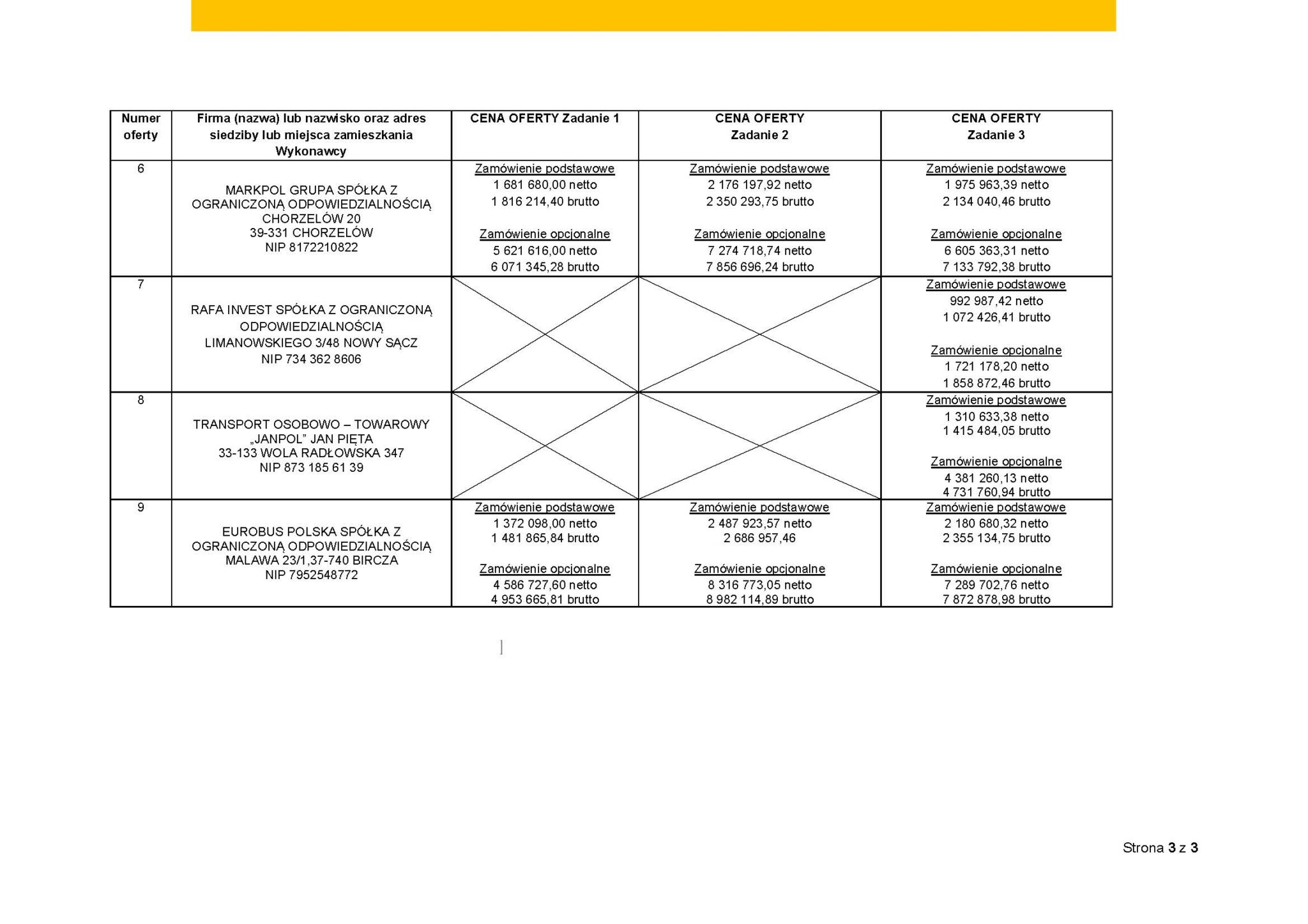 W zadaniu 3 najtańsza oferta również pochodzi od Transport osobowy „Mini-Bus” Andrzej Domagała – 1.154.870 PLN netto / 1.247.260 PLN brutto, co daje cenę jednostkową netto na poziomie 1,19 PLN/wzkm netto. Dalej znalazły się PKS Tarnobrzeg sp. z o.o. – 1.717.842 PLN netto / 1.855.269 PLN brutto, czyli 1,78 PLN/wzkm netto, oraz Markpol Grupa sp. z o.o. – 1.975.963 PLN netto / 2.134.040 PLN brutto, co daje 2,04 PLN/wzkm netto. Wyżej wycenione były także oferty Eurobus Polska sp. z o.o. – 2.180.680 PLN netto / 2.355.134 PLN brutto, czyli 2,26 PLN/wzkm netto; Firma Przewozowa Michalus Michał Bodzioch – 2.269.687 PLN netto / 2.451.262 PLN brutto, czyli 2,35 PLN/wzkm netto; oraz P.P.H.U. Mark-Trawel Marek Wielgus – 2.336.443 PLN netto / 2.523.358 PLN brutto, co oznacza 2,42 PLN/wzkm netto.