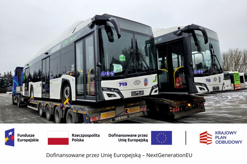 - Z Krajowego Planu Odbudowy sfinansowano zakup 25 autobusów elektrycznych oraz 16 ładowarek (13 podwójnych punktów wolnego ładowania o mocy 60–120 kW oraz 3 szybkie ładowarki 400 kW). Wartość projektu to ok. 88,5 mln zł brutto, z czego ok. 68,5 mln zł pochodzi z UE.