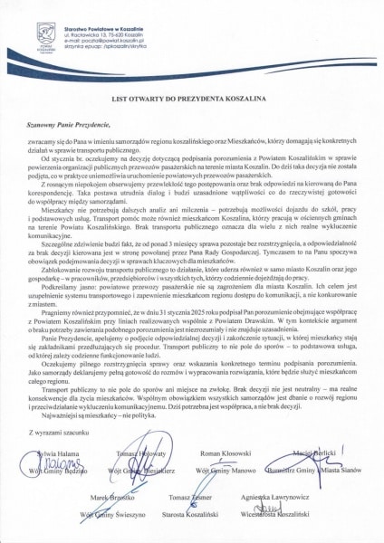 „Od stycznia br. oczekujemy na decyzję dotyczącą podpisania porozumienia (…) Do dziś taka decyzja nie została podjęta, co w praktyce uniemożliwia uruchomienie powiatowych przewozów pasażerskich” – podkreślili samorządowcy w liście otwartym. – „Mieszkańcy nie oczekują kolejnych analiz, lecz realnych działań” – dodali.